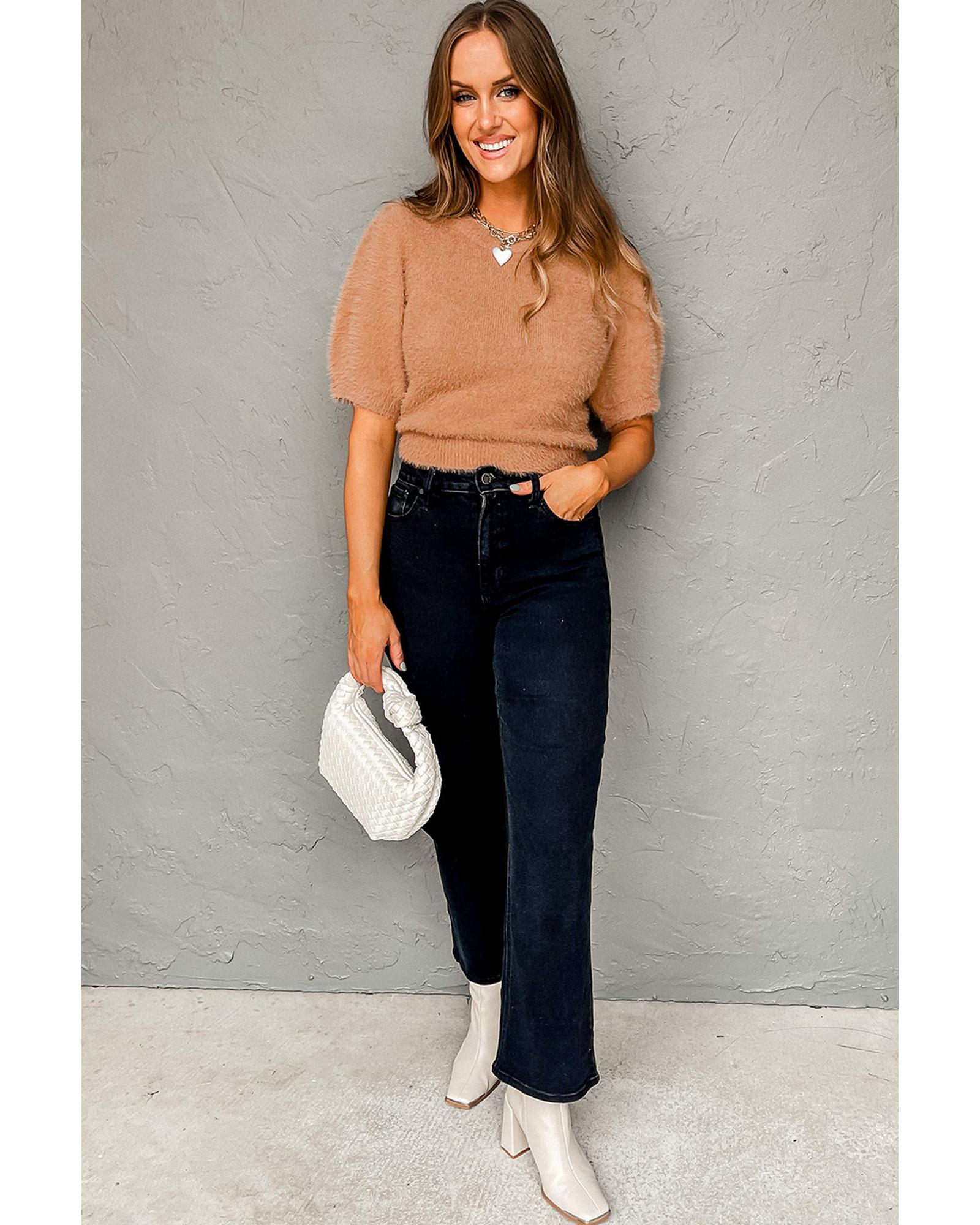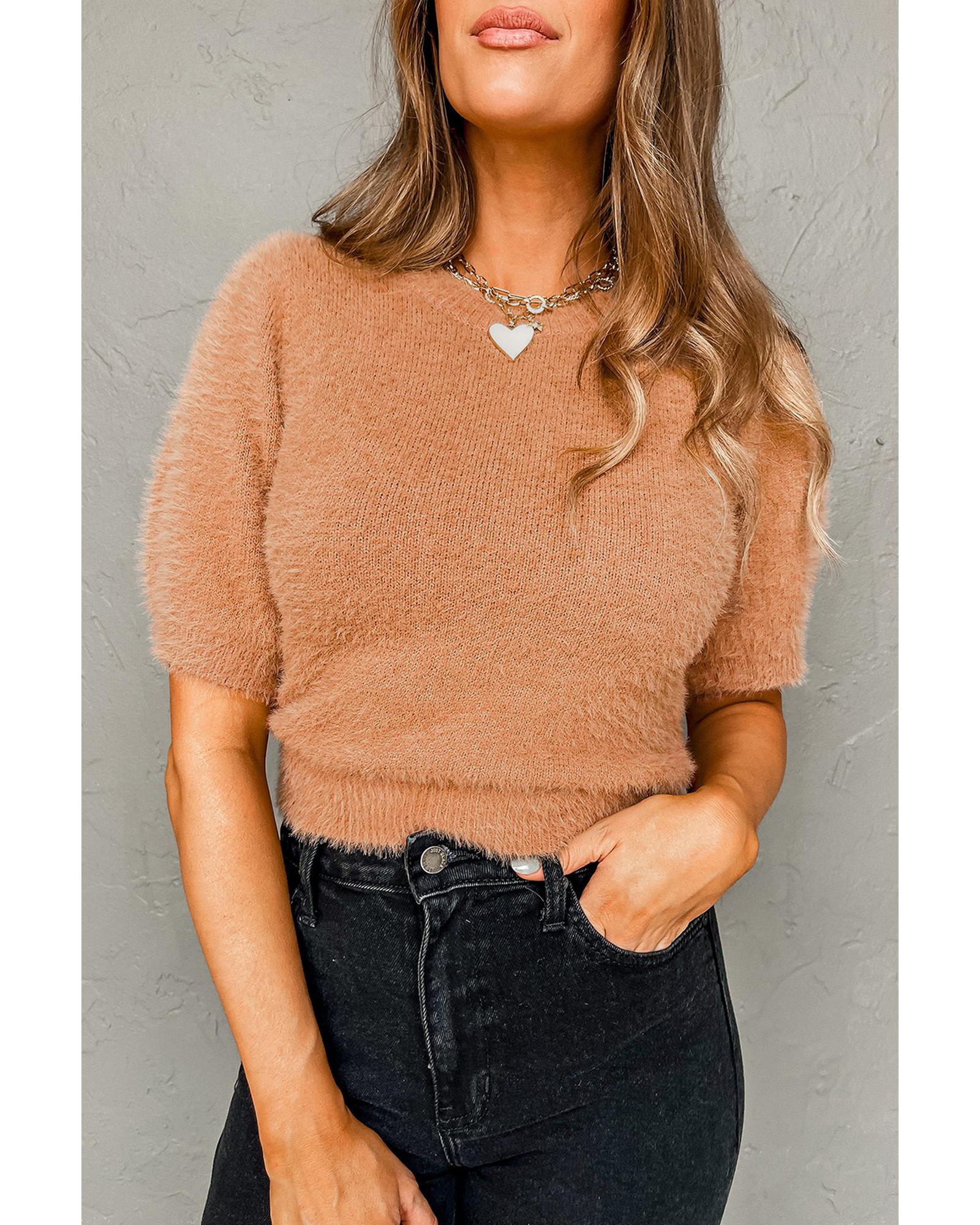 Light French Beige Fuzzy Short Sleeve Sweater – M