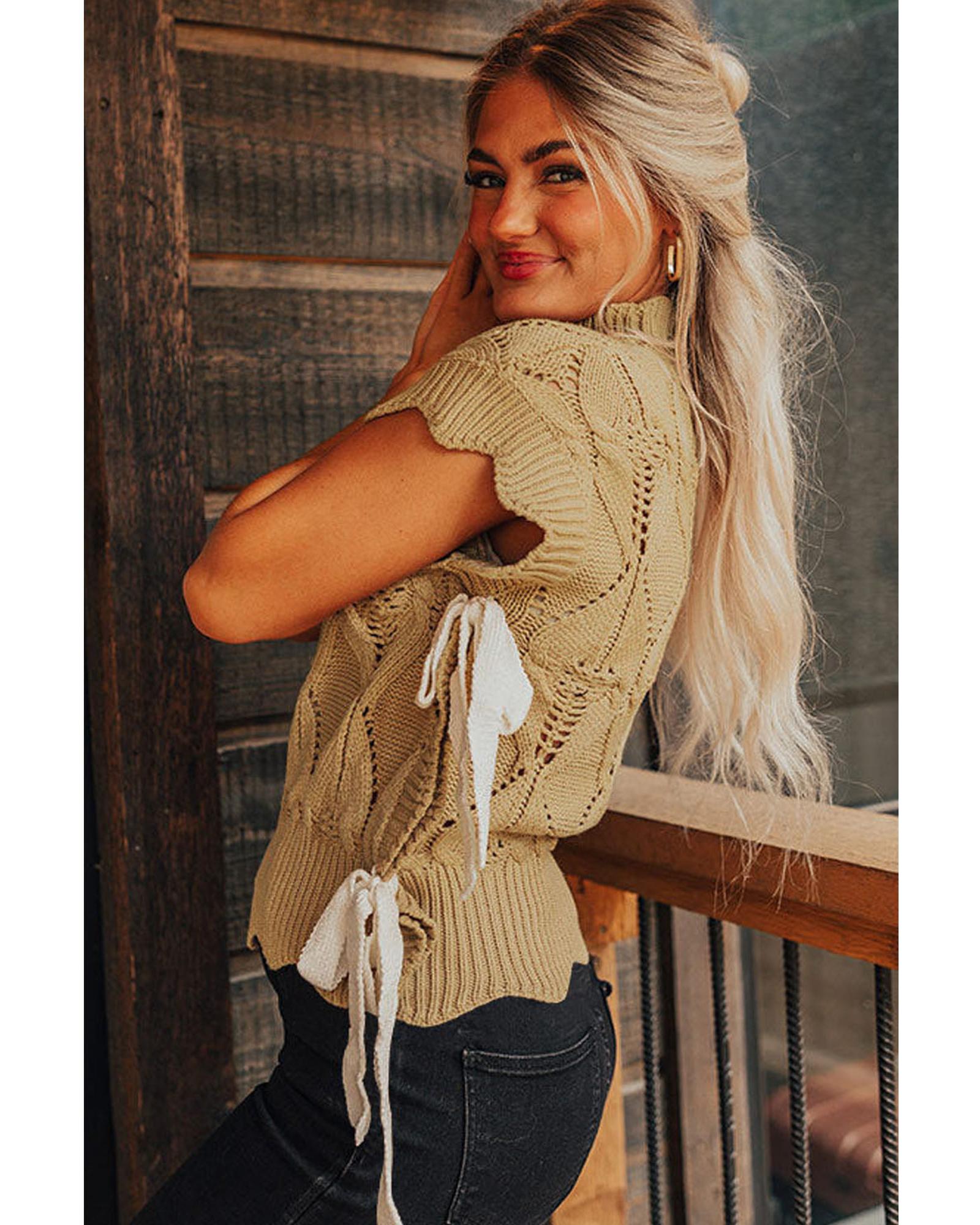 Light French Beige Hollowed Knit Scalloped Trim High Neck Sweater – L