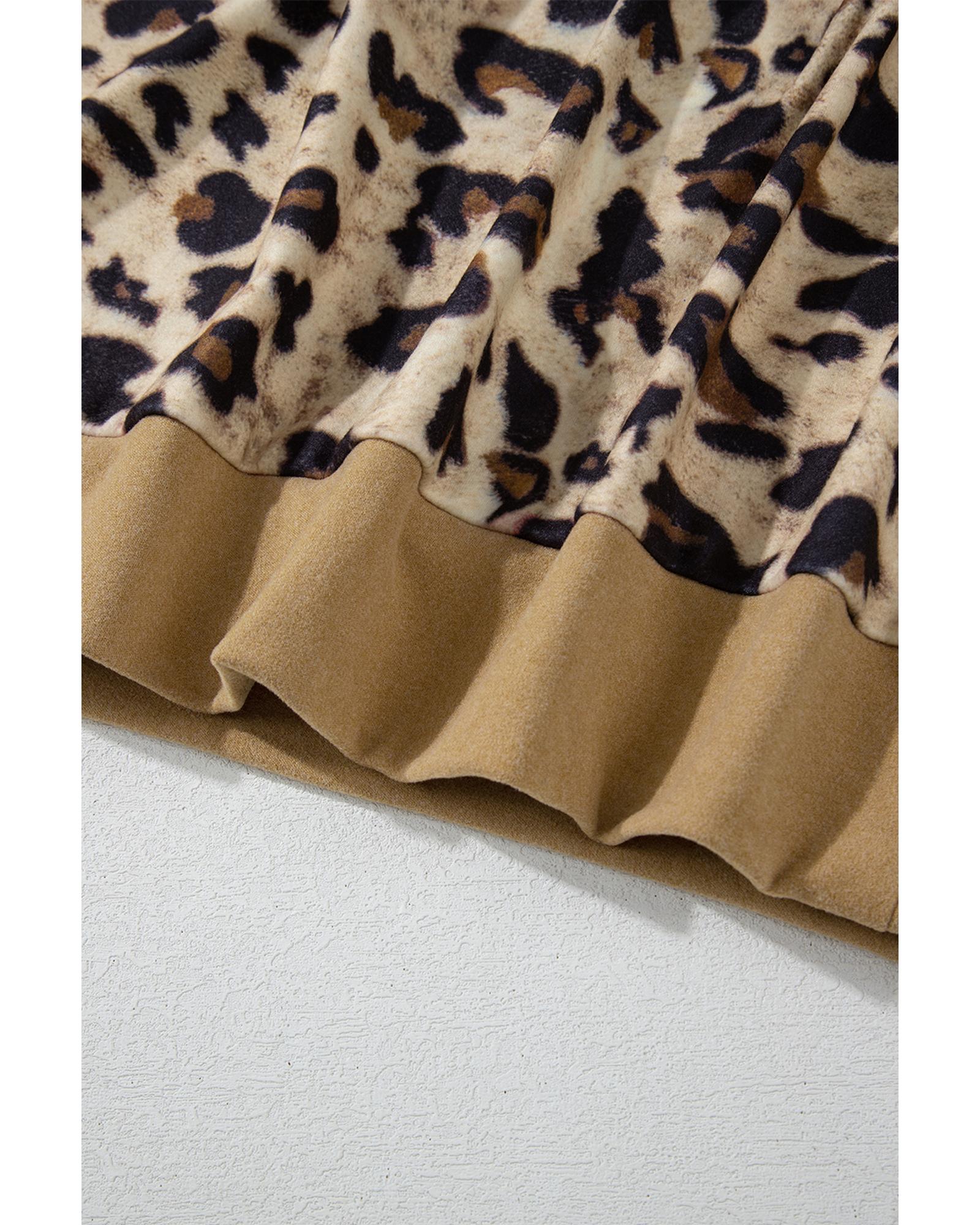 Light French Beige Leopard Print Patchwork Raglan Sleeve Half Buttons Hoodie – S