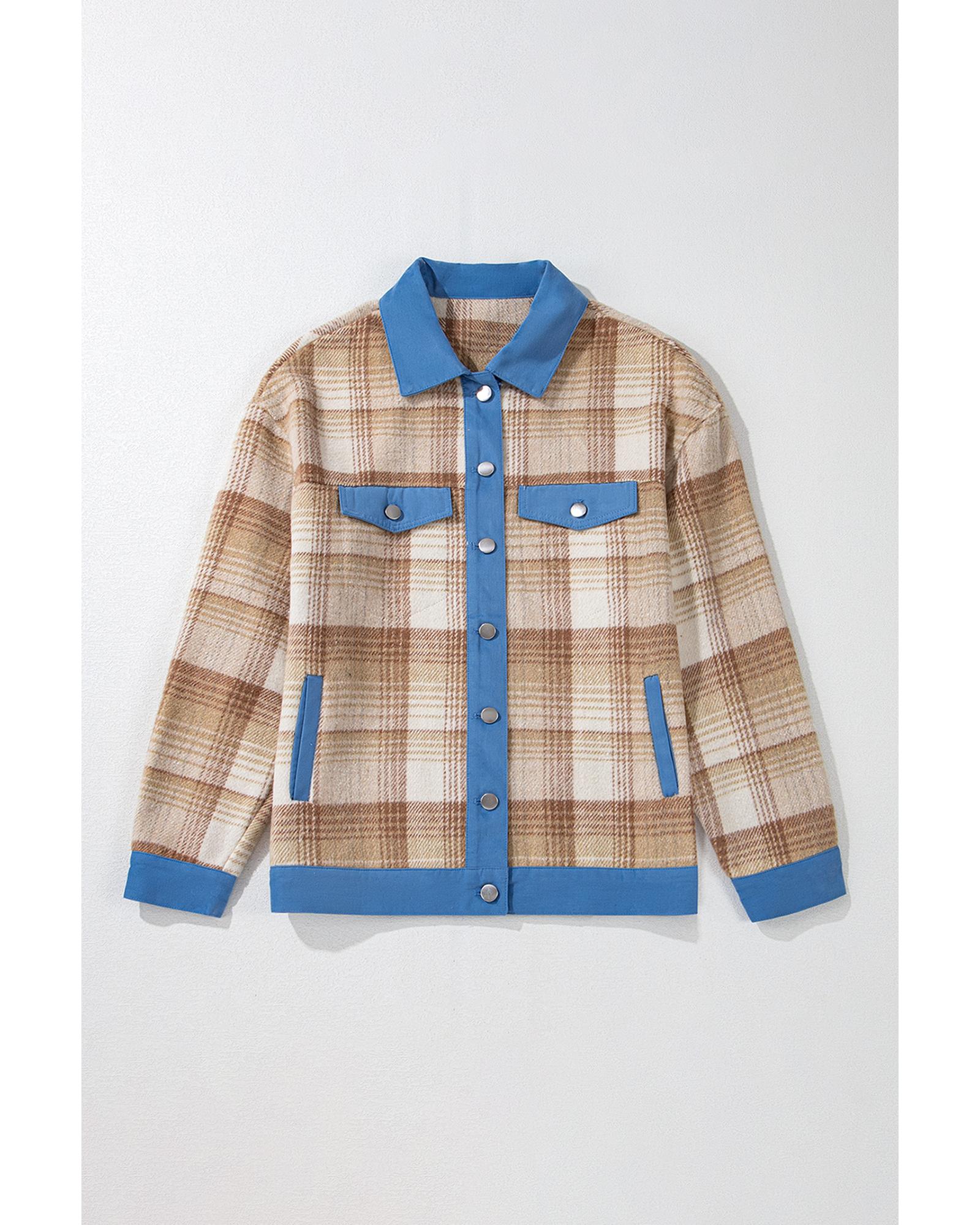 Light French Beige Plaid Patchwork Flap Detail Button Up Shacket – L