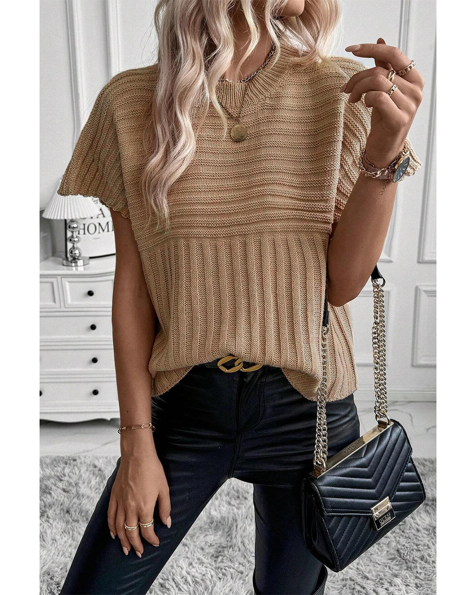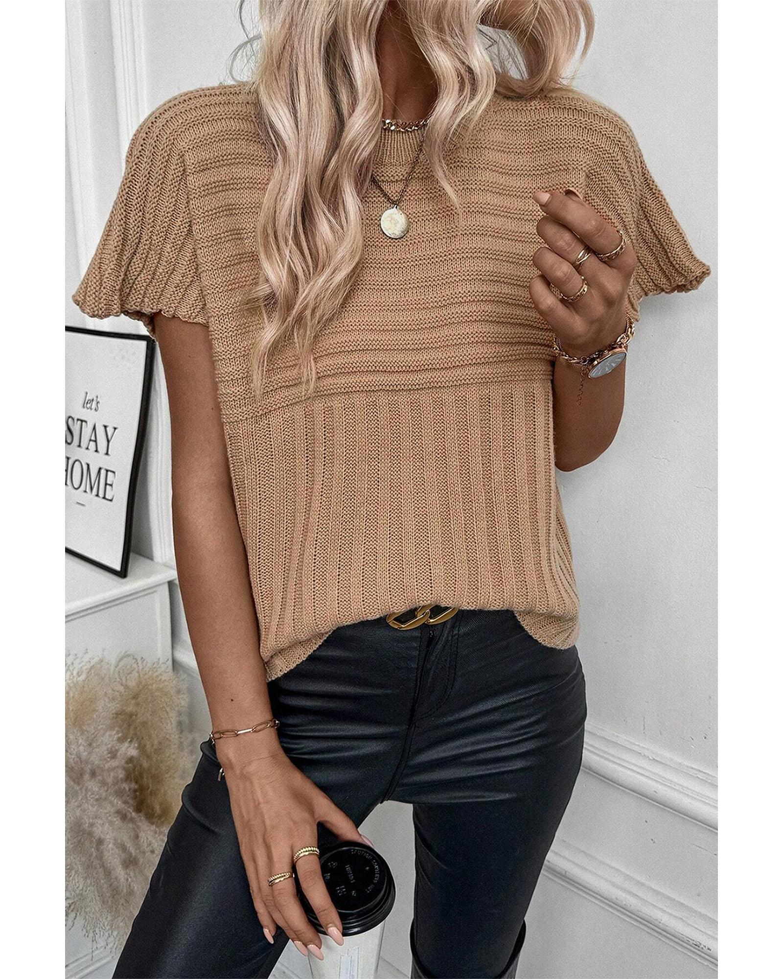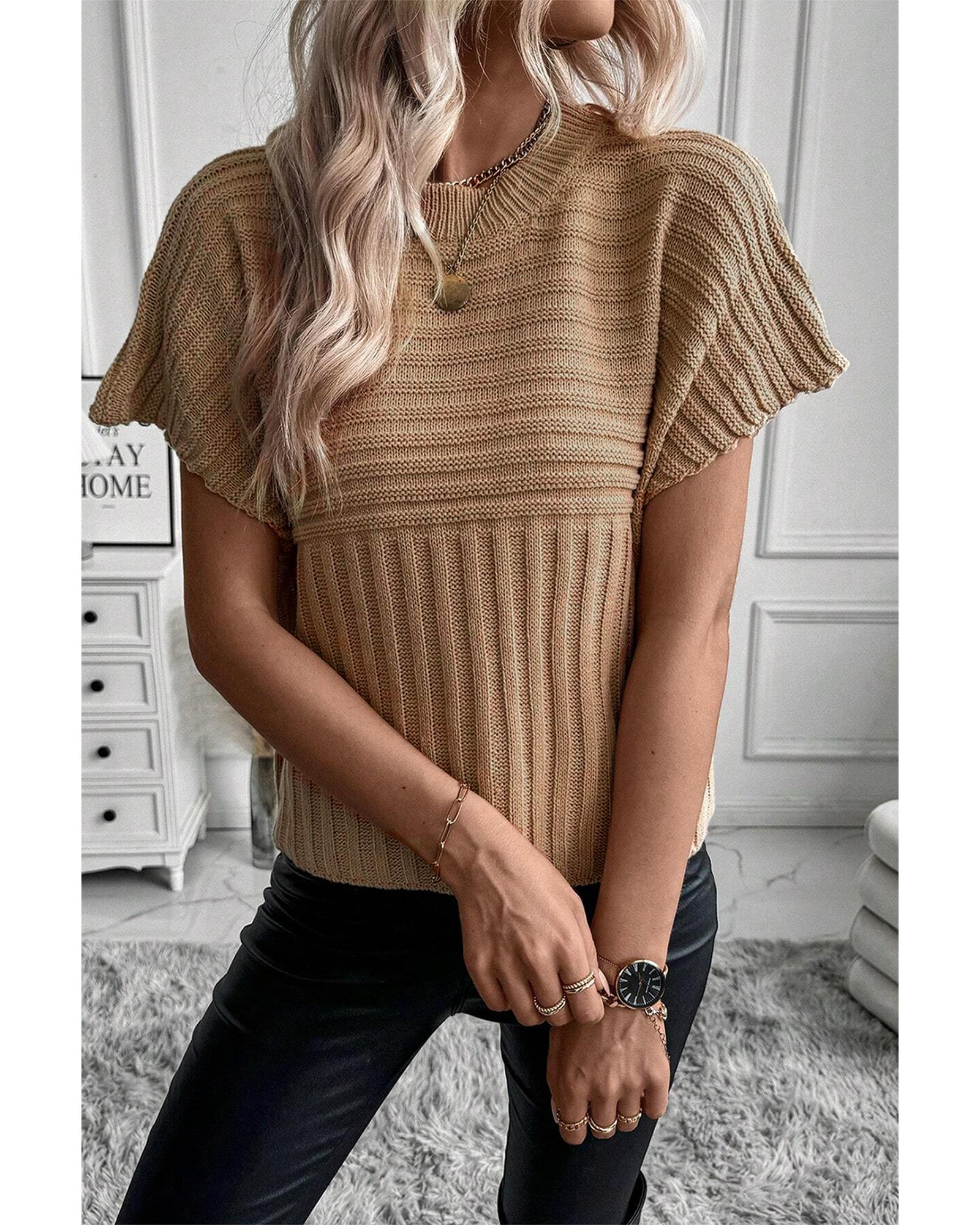 Light French Beige Rib Knitted Wide Sleeve Sweater T Shirt – L