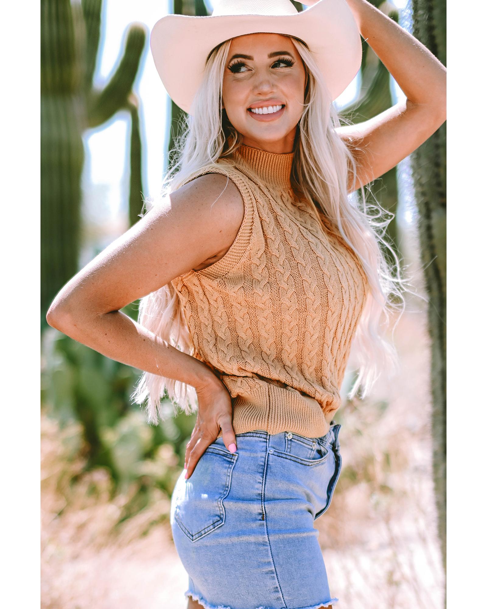 Light French Beige Solid Color Cable Knit High Neck Tank Top – M