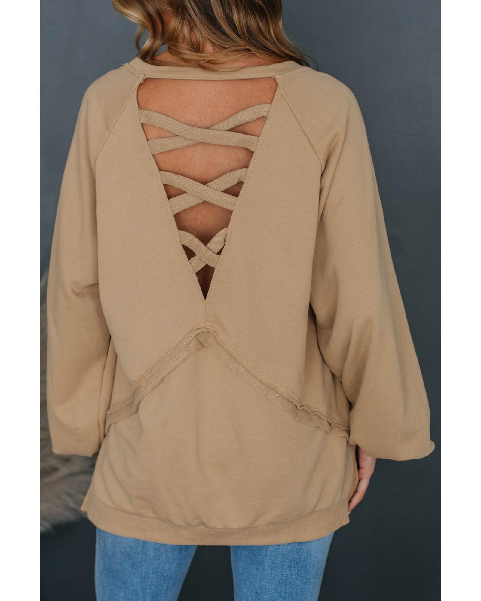 Light French Beige Solid Color Lattice Hollow Out Back Sweatshirt – L