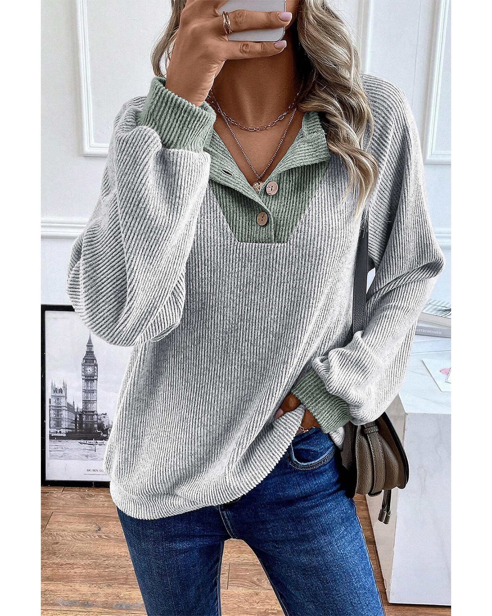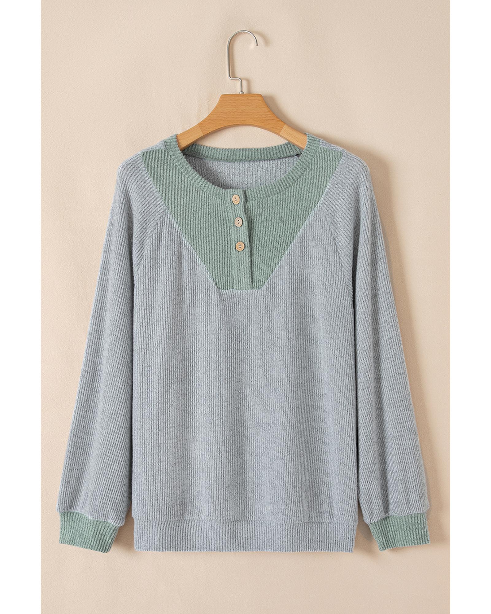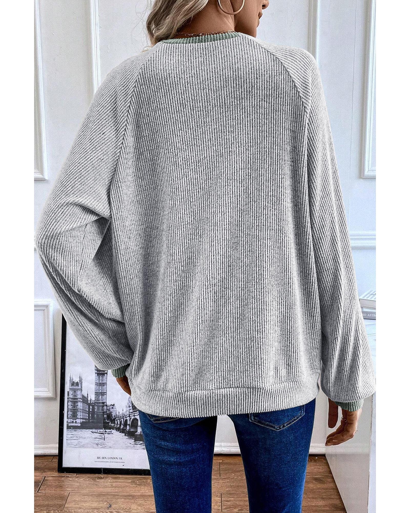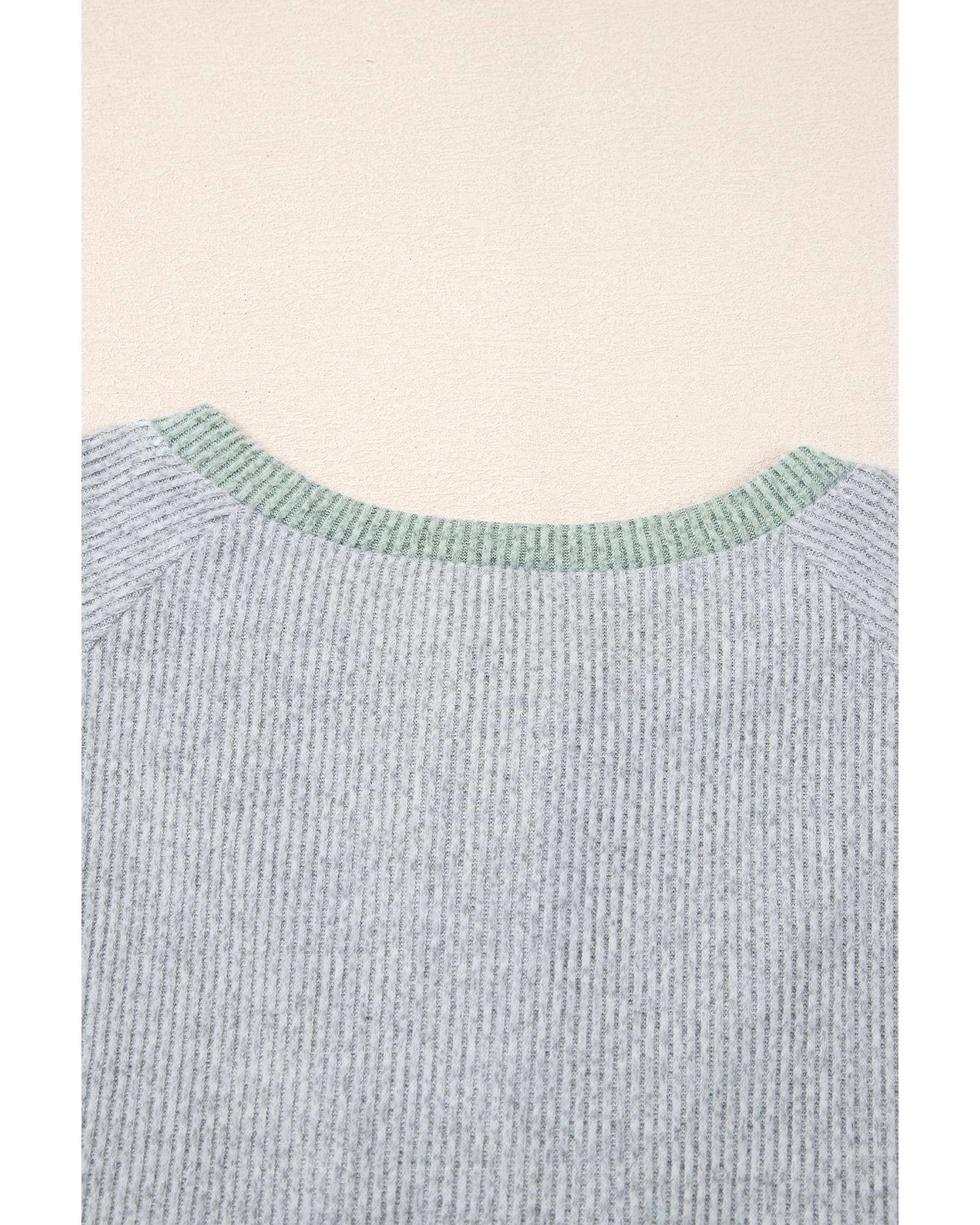 Light Grey Color Contrast Ribbed Loose Fit Long Sleeve Top – L
