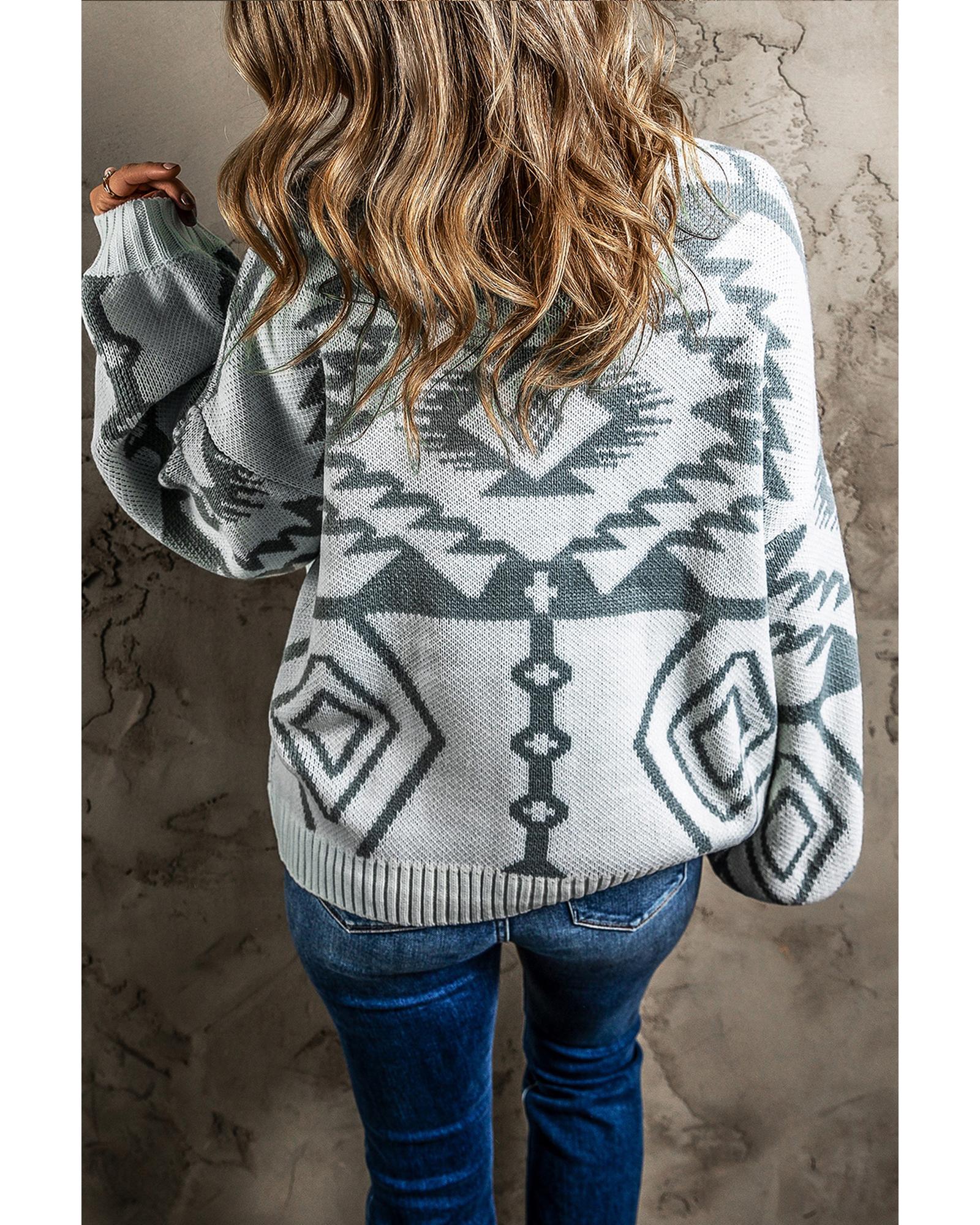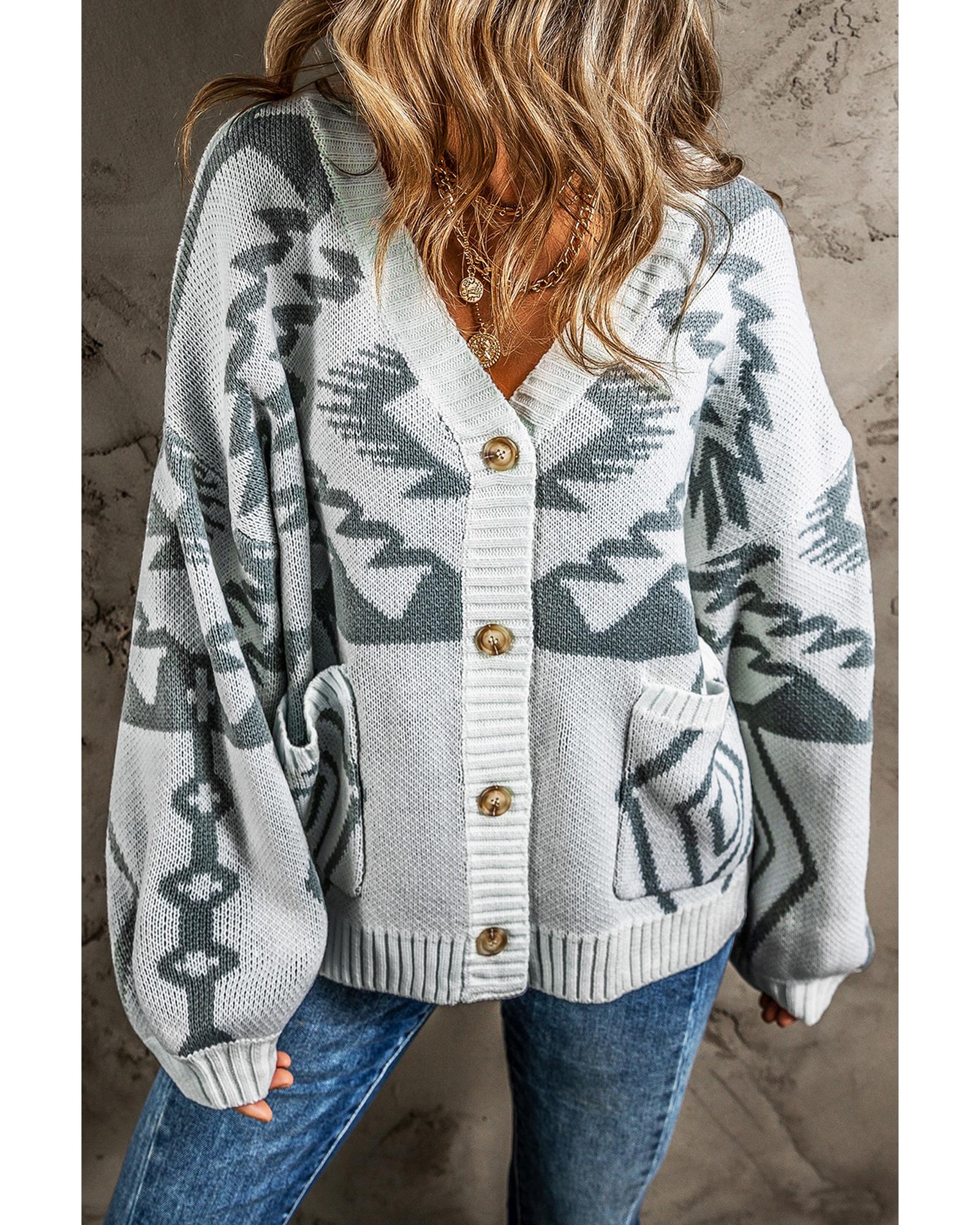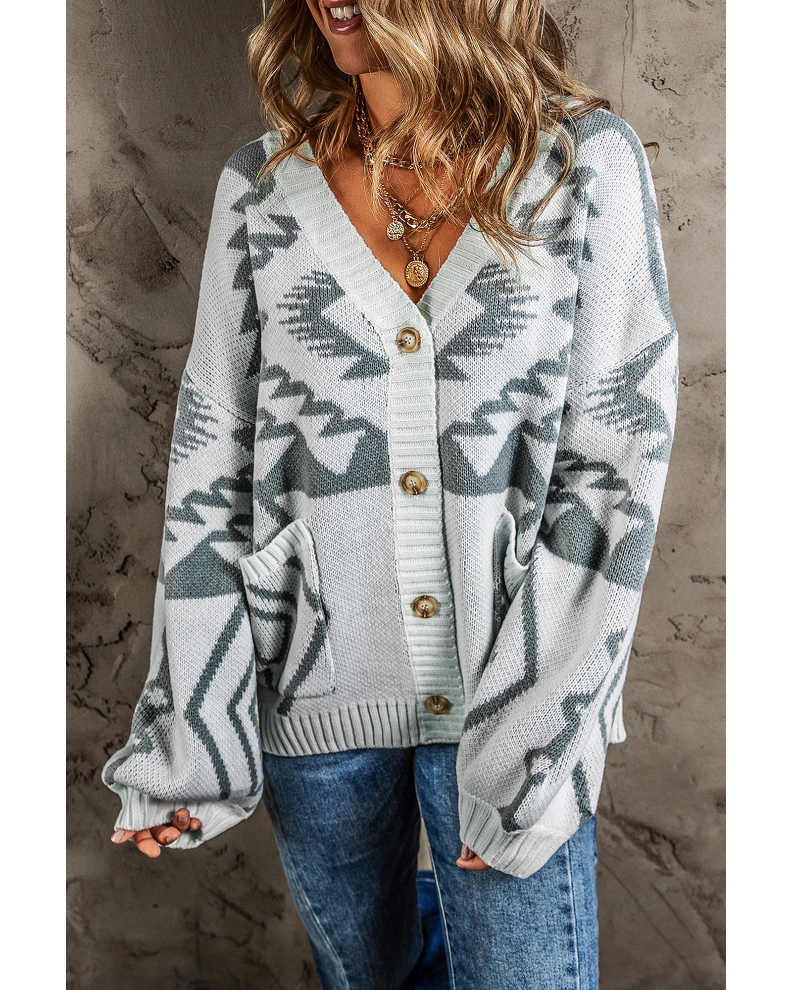 Light Grey Geometric Pattern Ribbed Trim Button-Up Cardigan – L
