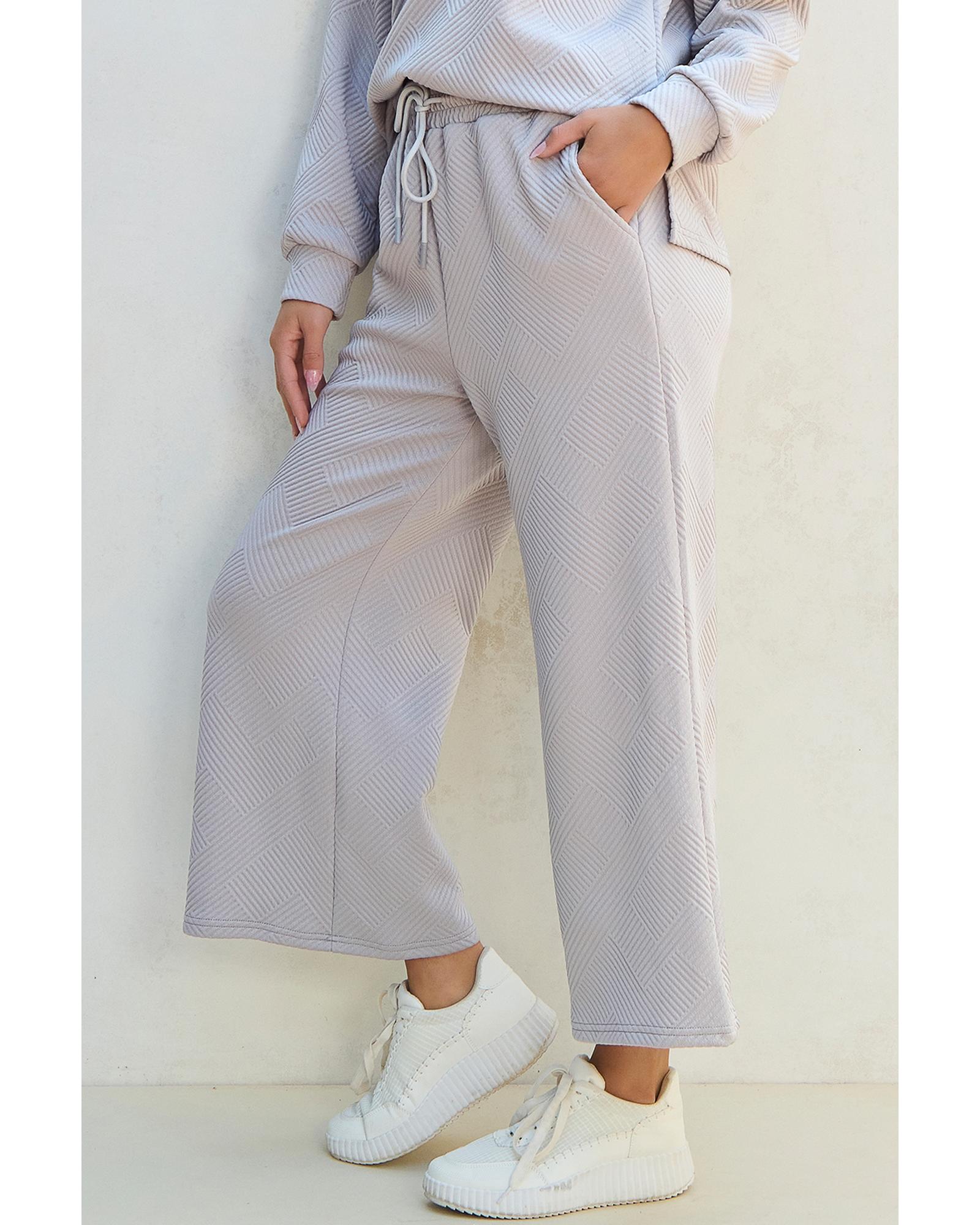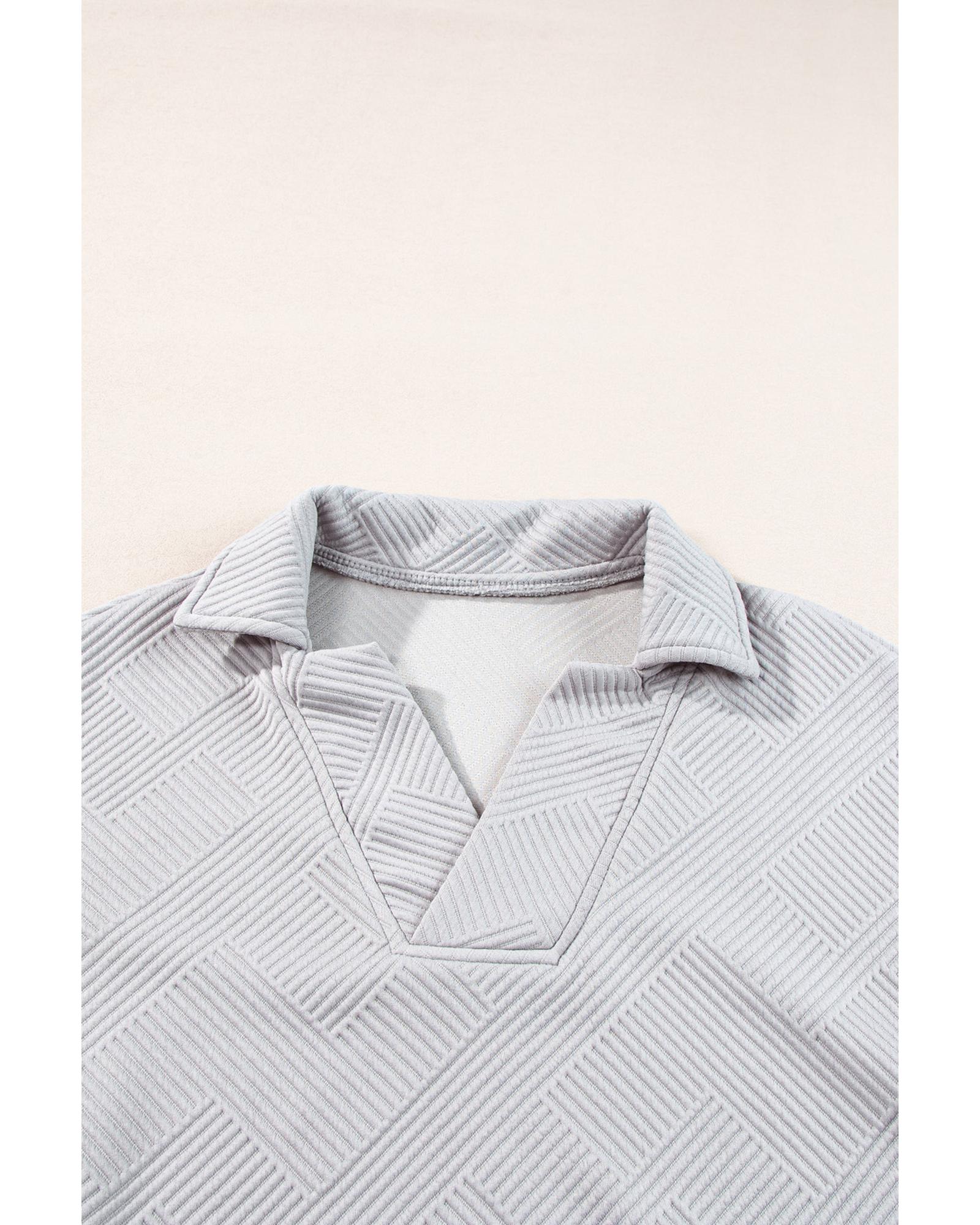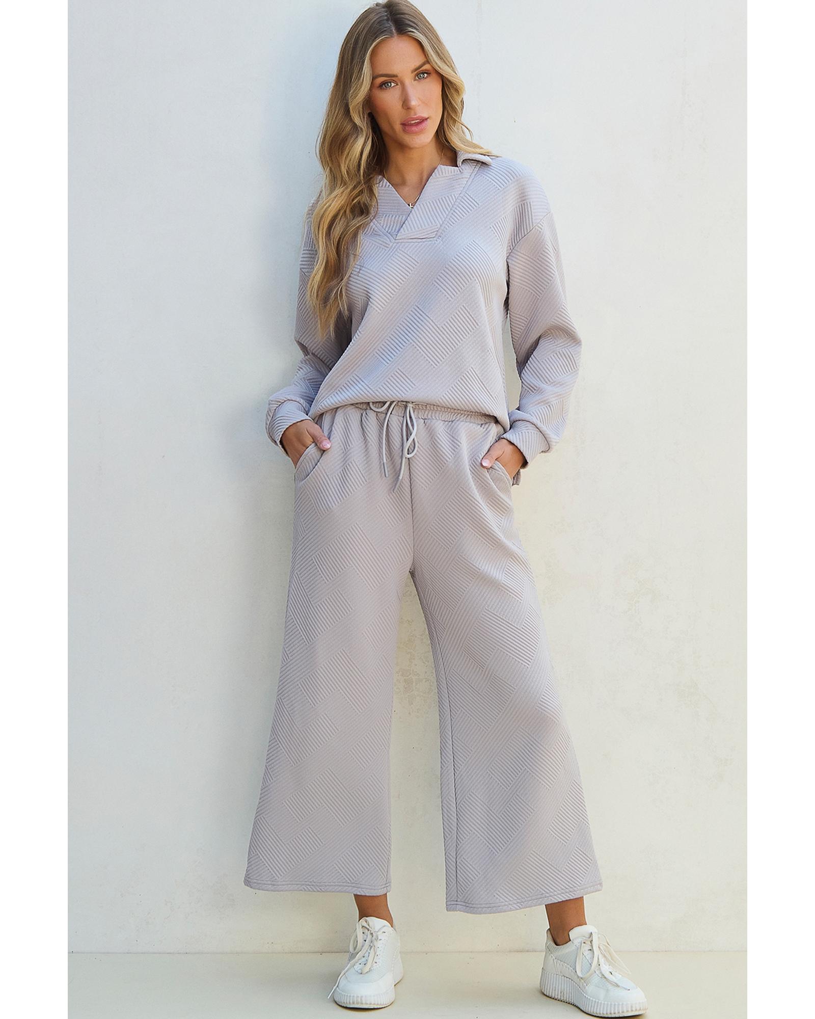 - Light Grey Solid Textured Collared V Neck Top and Wide Leg Pants Set