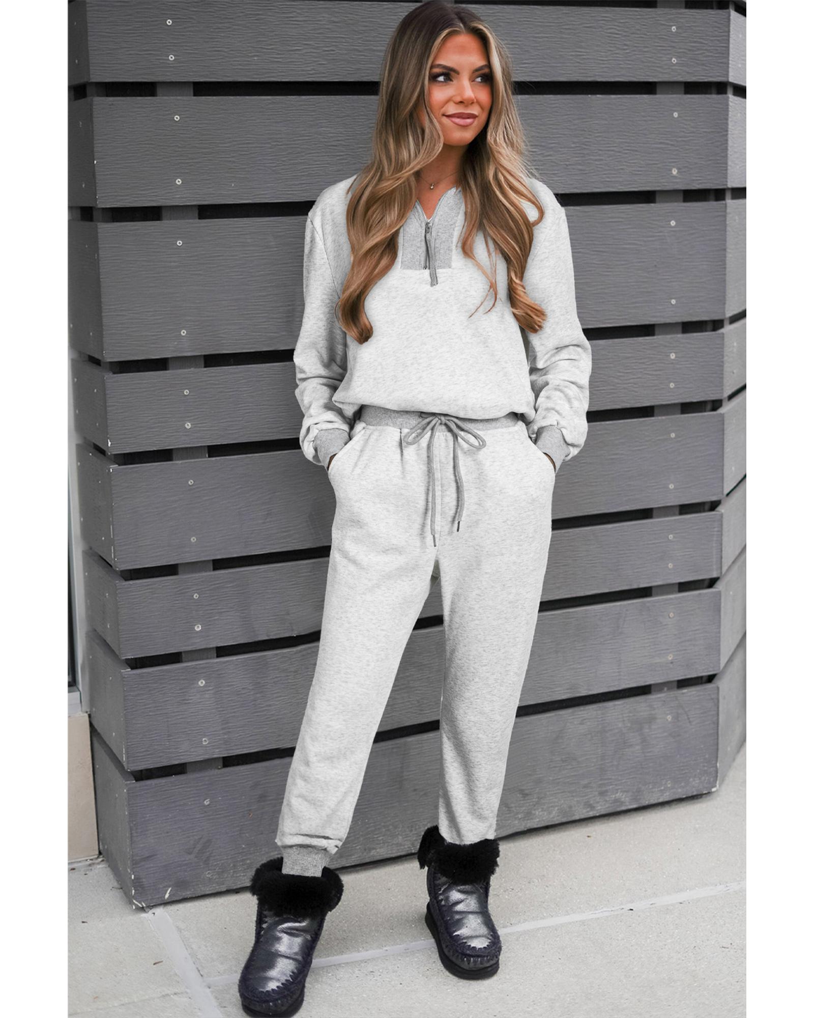 Light Grey Solid Zip Pullover Top and Drawstring Joggers Set – XL
