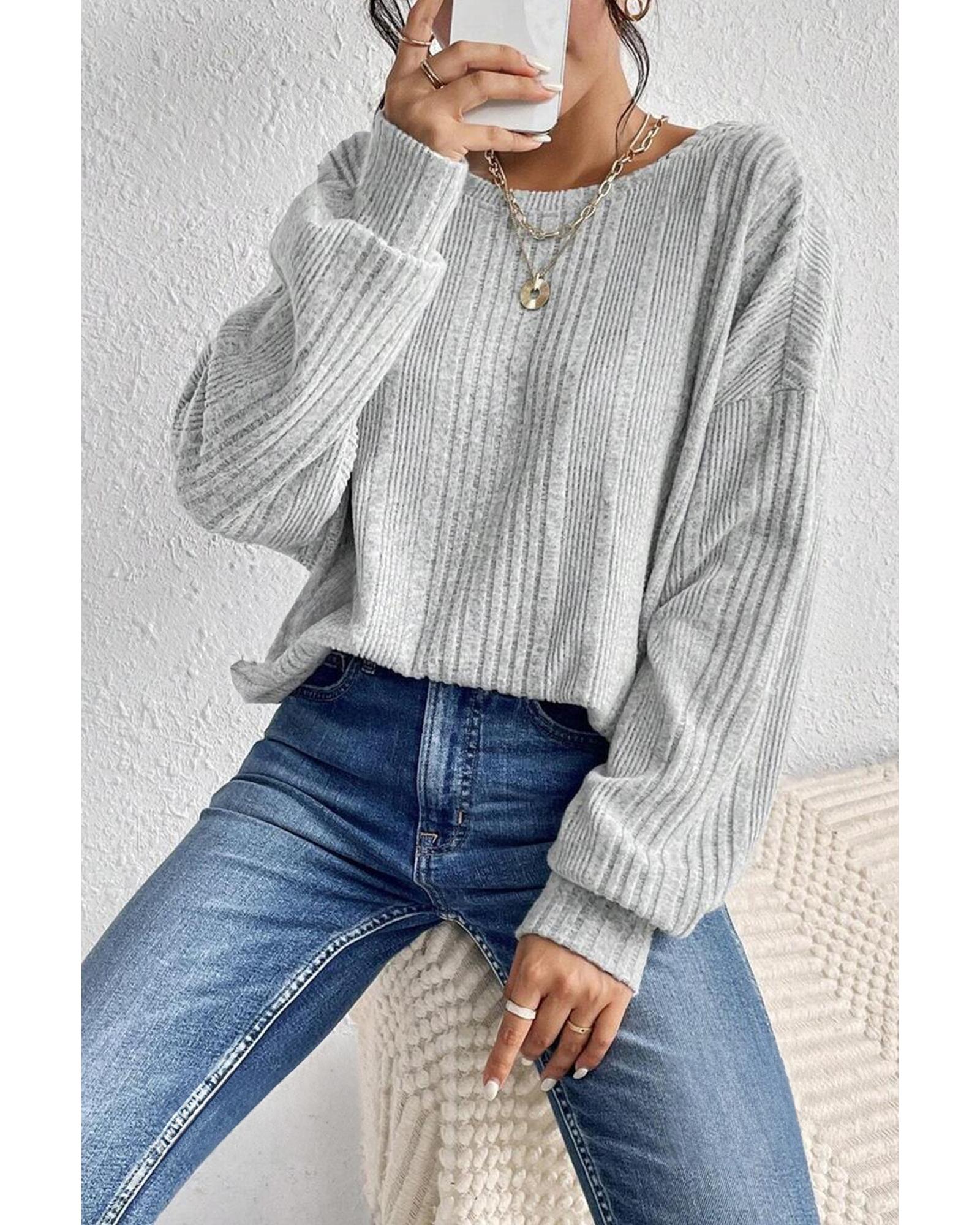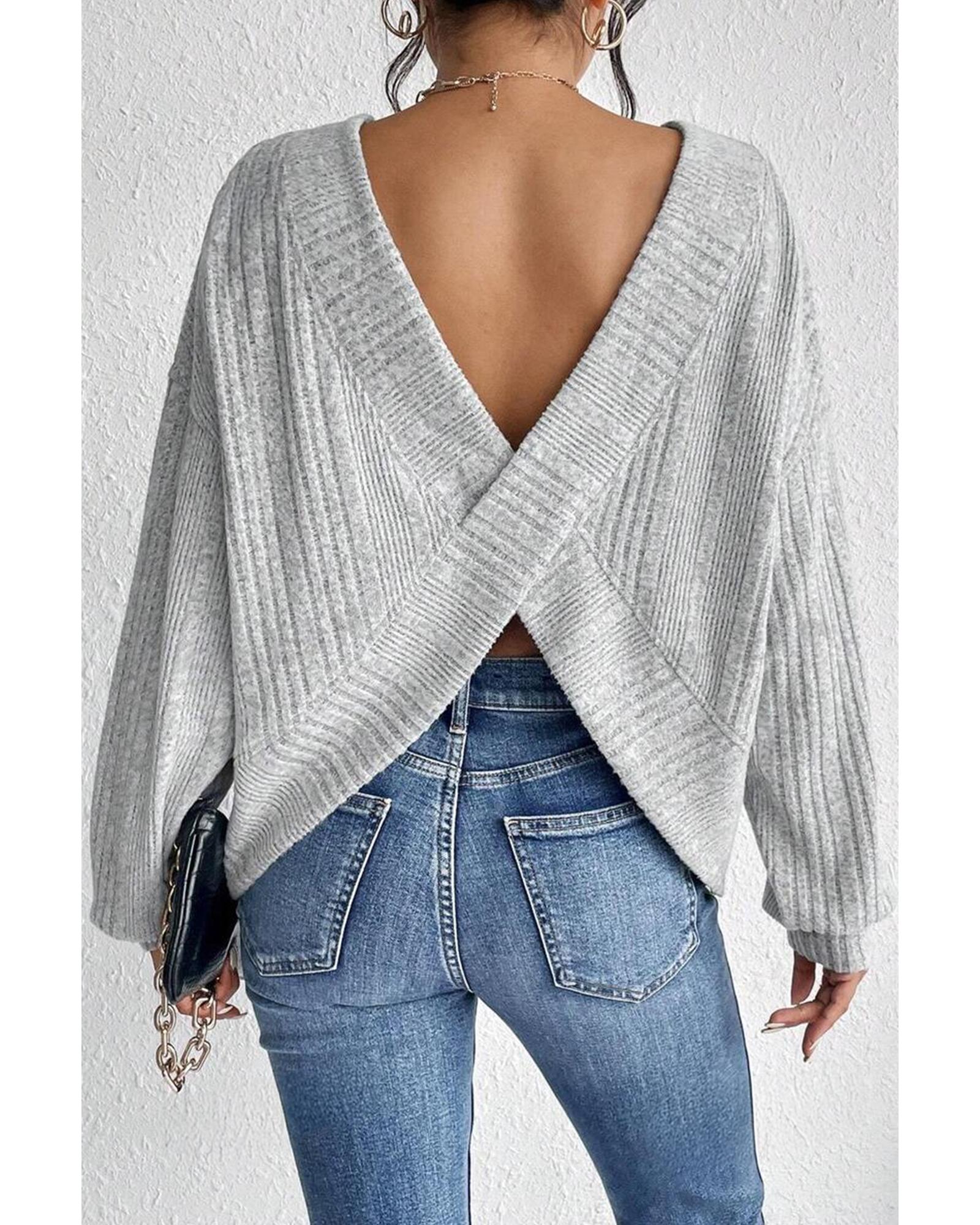 Light Grey Textured Crossover Backless Knit Long Sleeve Top – L