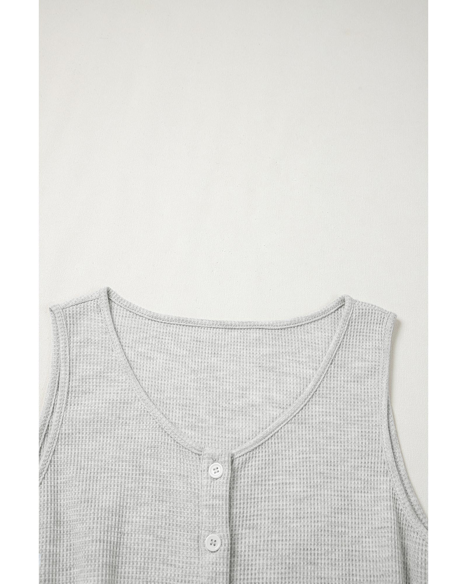 Light Grey Waffle Knit Sleeveless Buttoned Front Drawstring Waist Romper – XL