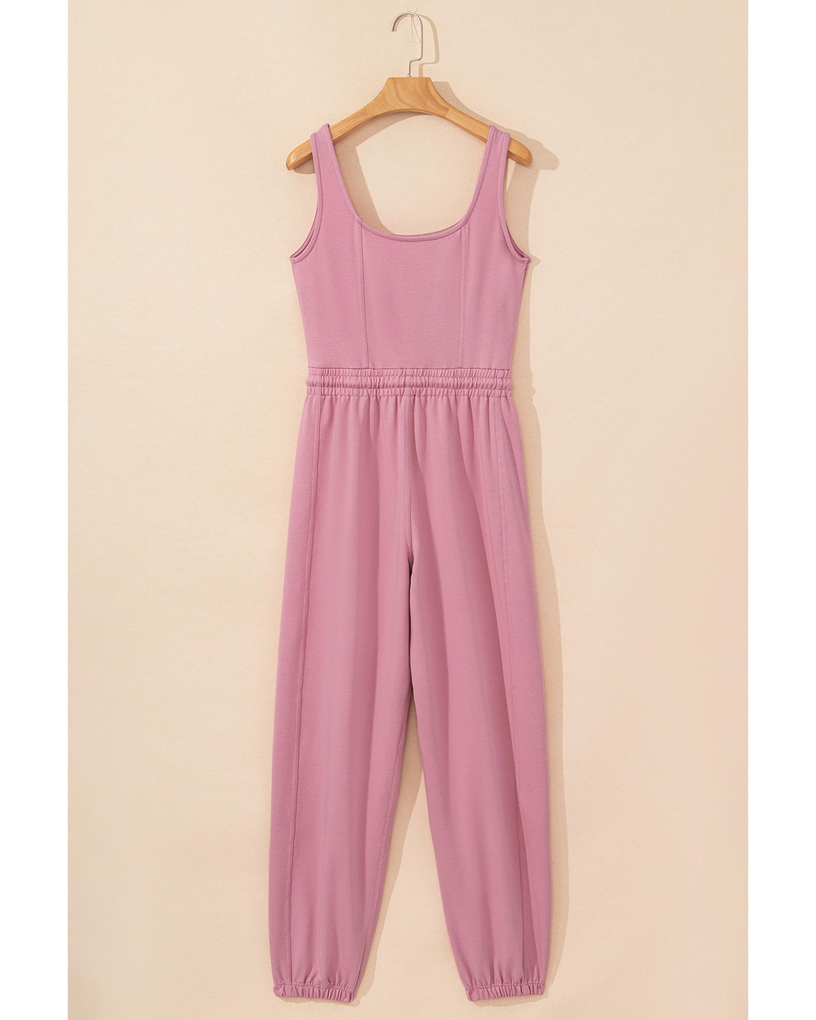 Light Pink Lace-up Elastic Waist Sleeveless Square Neck Jumpsuit – XL