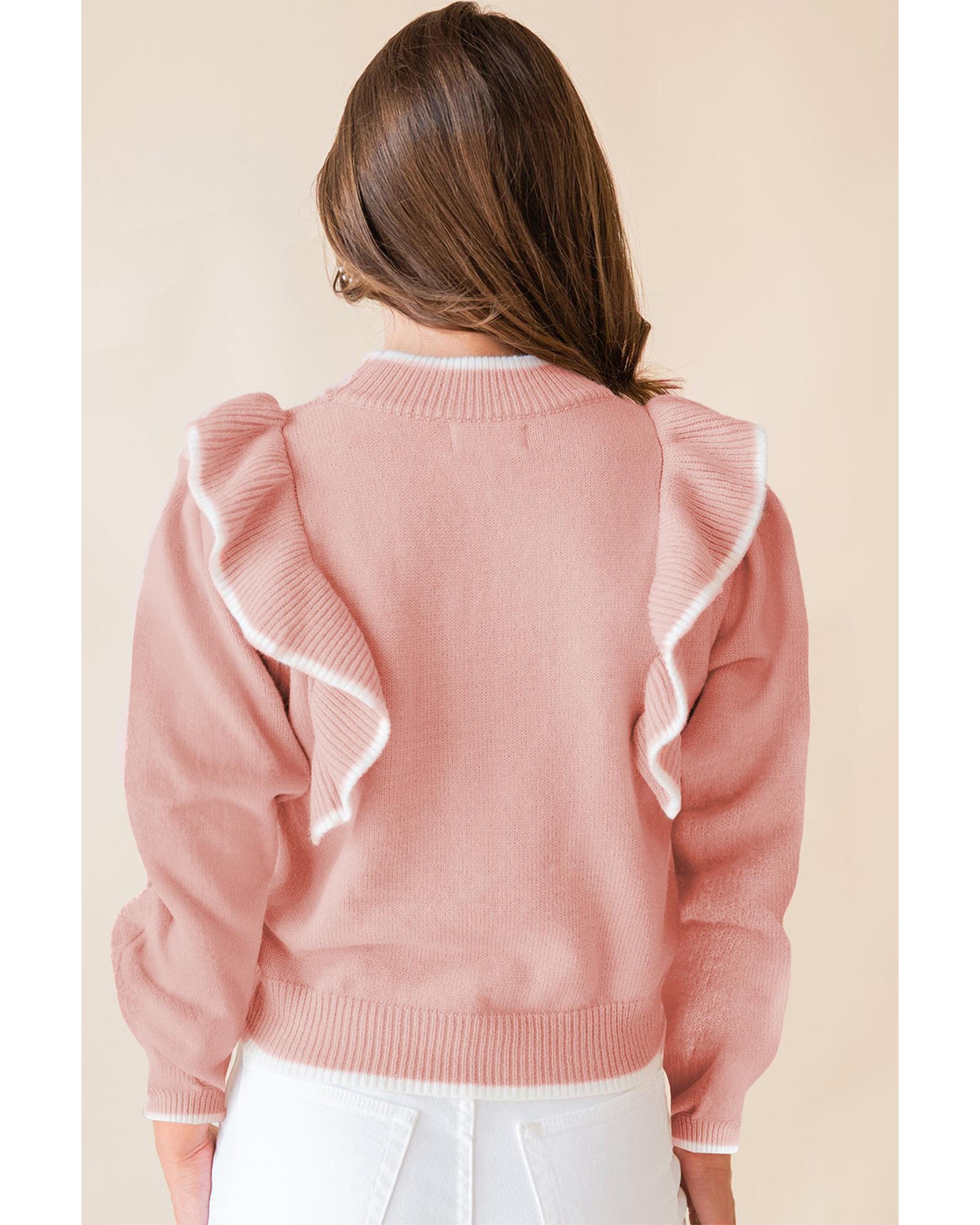 Light Pink Ruffled Bowknot Ribbed Trim Long Sleeve Sweater – XL