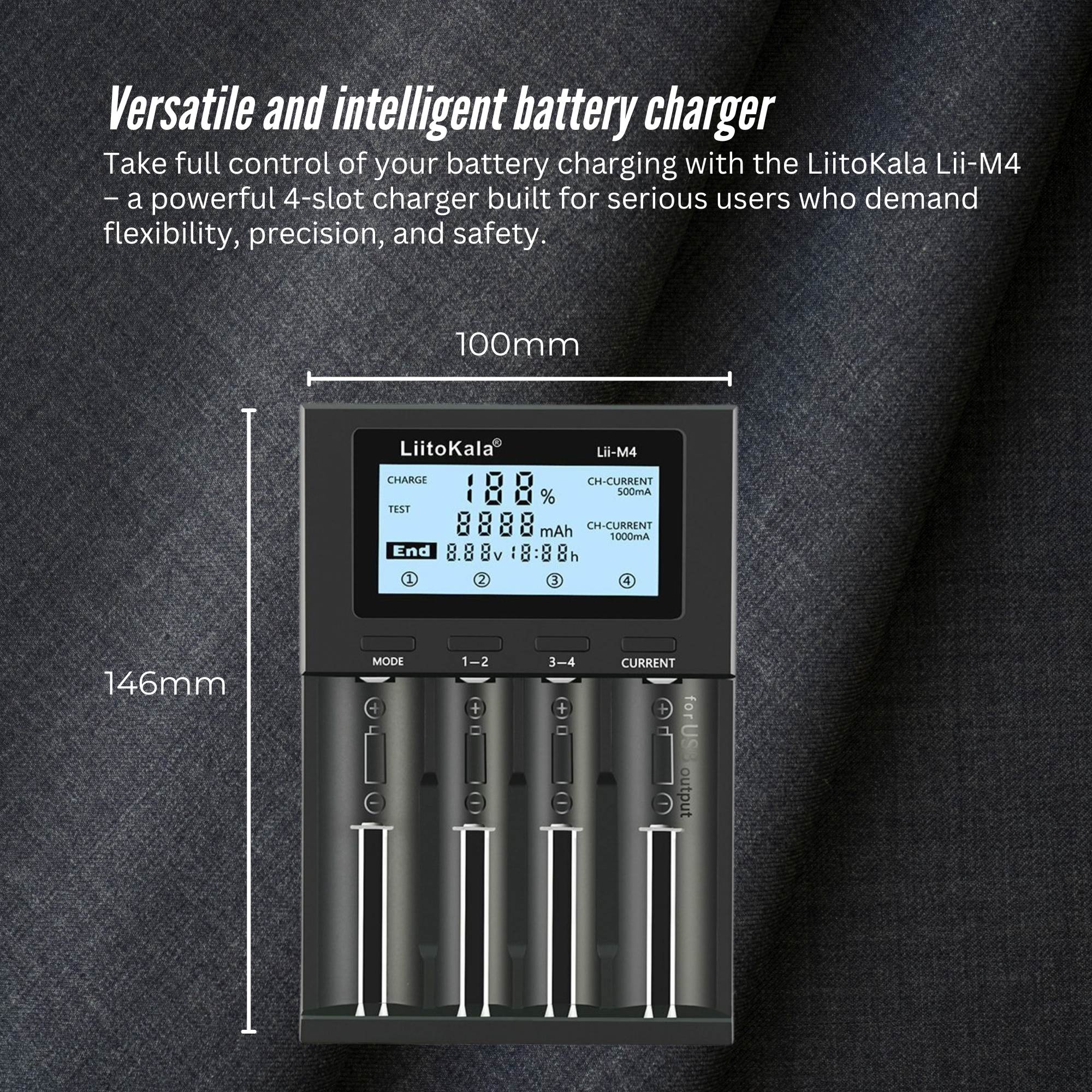LiitoKala Lii-M4 Smart Battery Charger LCD – 4-Slot USB for 18650 AA AAA Li-ion