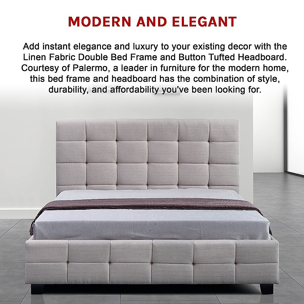 Your master bedroom deserves the best. Add instant elegance and luxury to your existing decor with the Linen Fabric Double Bed Frame and Button Tufted Headboard. Courtesy of Palermo, a leader in furniture for the modern home, this bed frame and headboard has the combination of style, durability, and affordability you've been looking for.