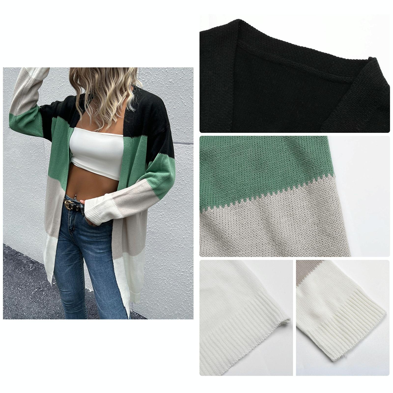 Long Cardigan Open Front Colour Block Cardigan Knit Sweaters Green – L