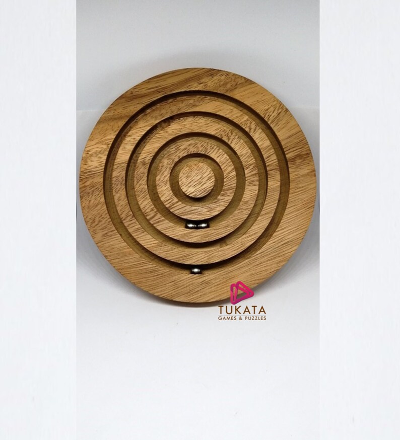 This wooden marble circular maze is awesome and addictive fun! Perfect for children, the objective of this puzzle is to move the three metal balls through the four concentric circles of the maze to the center.