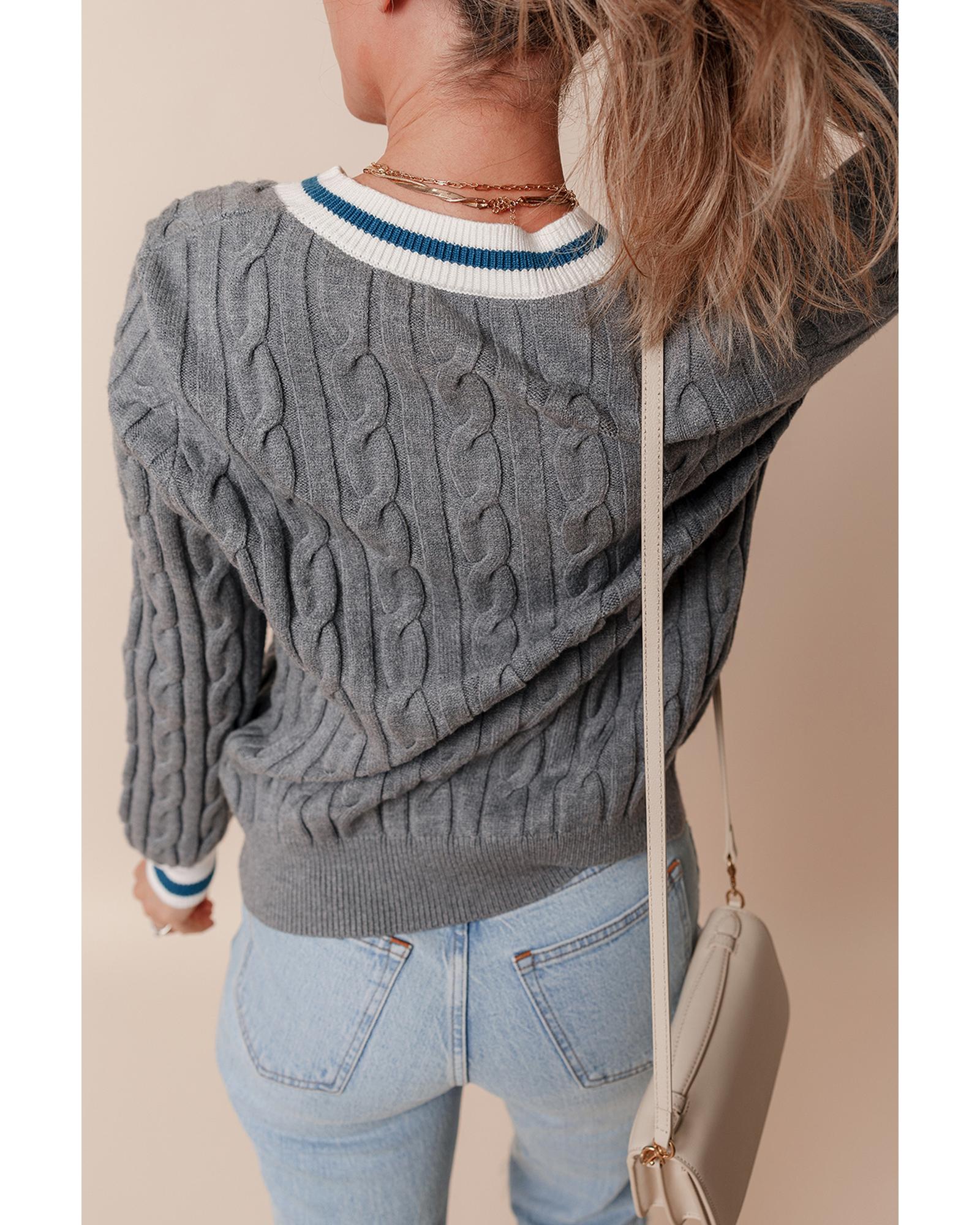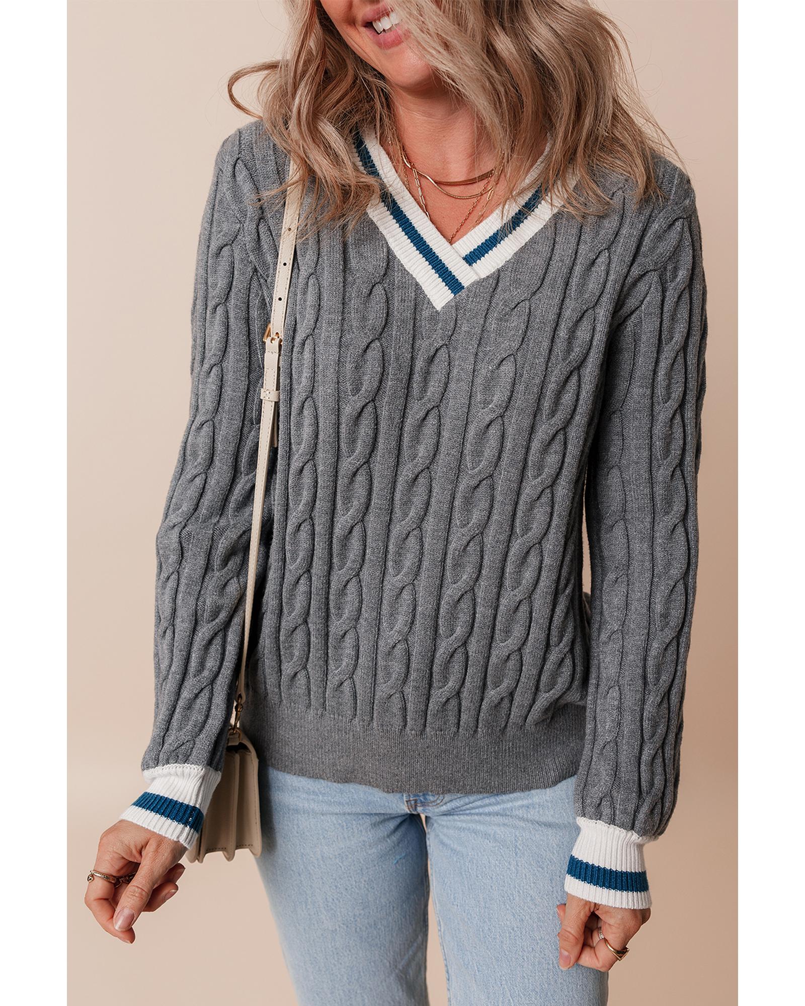 Medium Grey Color Contrast Ribbed Edge Cable Knit V Neck Sweater – XL