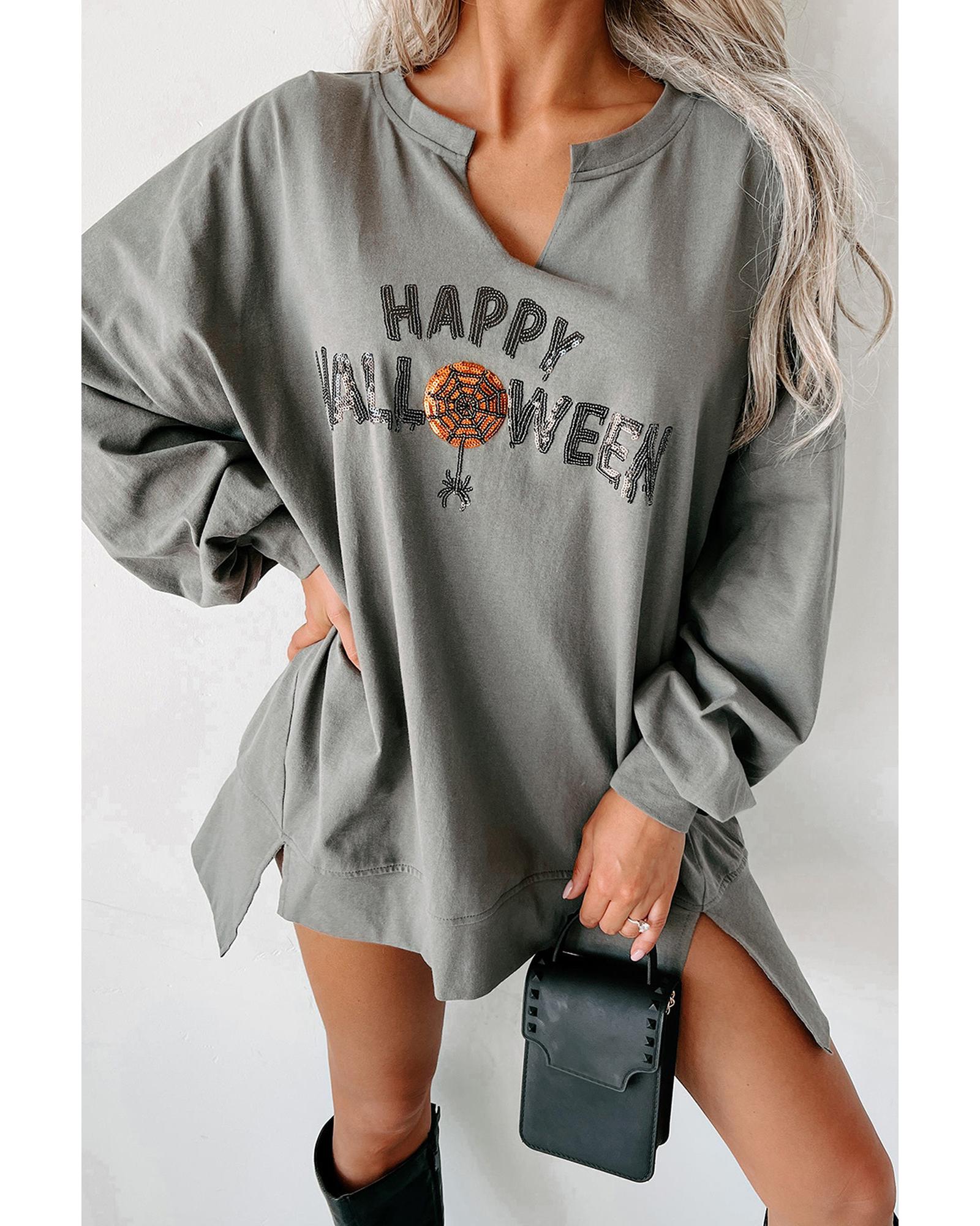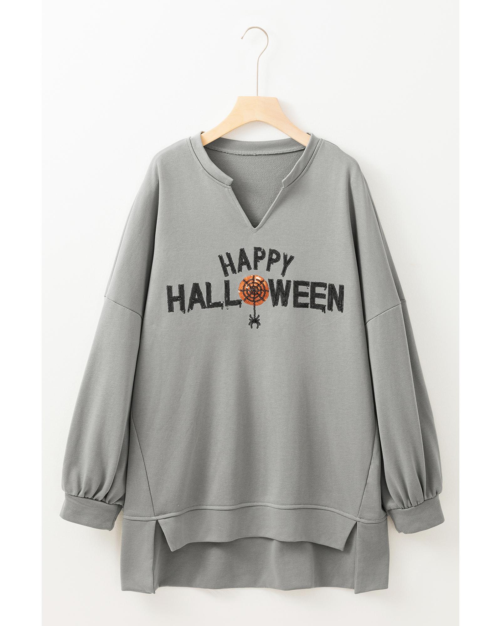 Medium Grey Sequin Happy Halloween Graphic Notched Neck Long Sleeve Loose Top – S