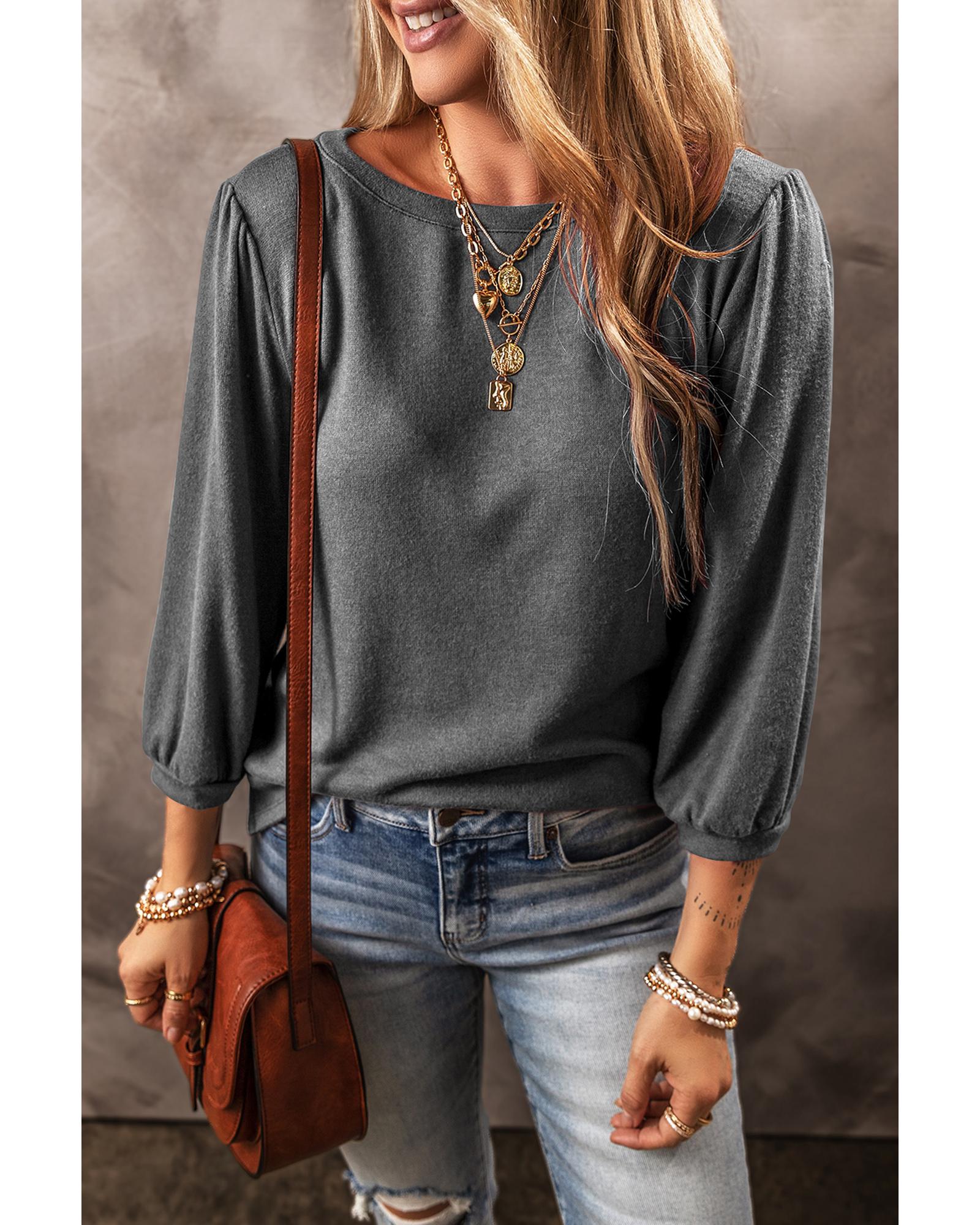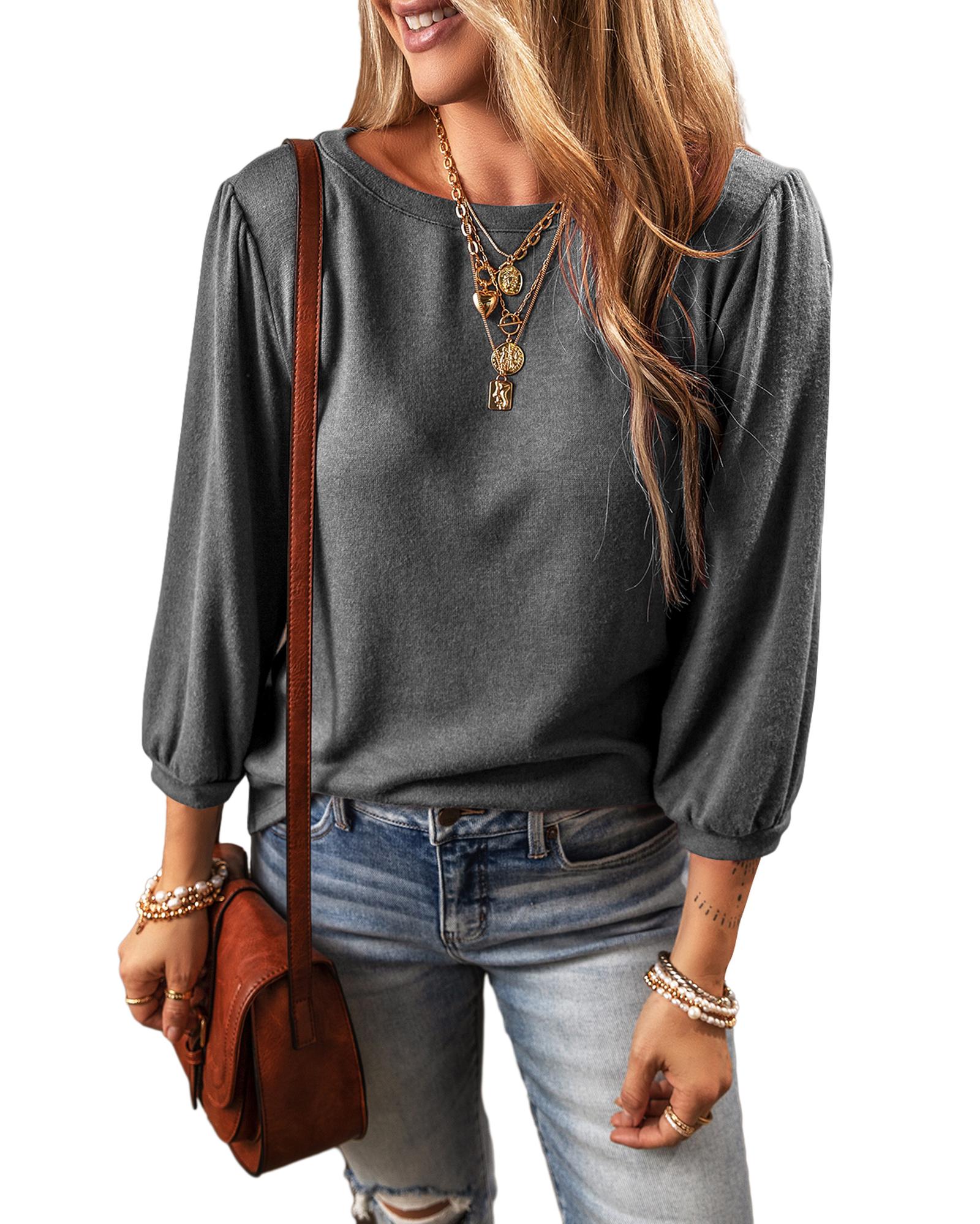 Medium Grey Solid Color 3/4 Sleeve Round Neck Blouse – L