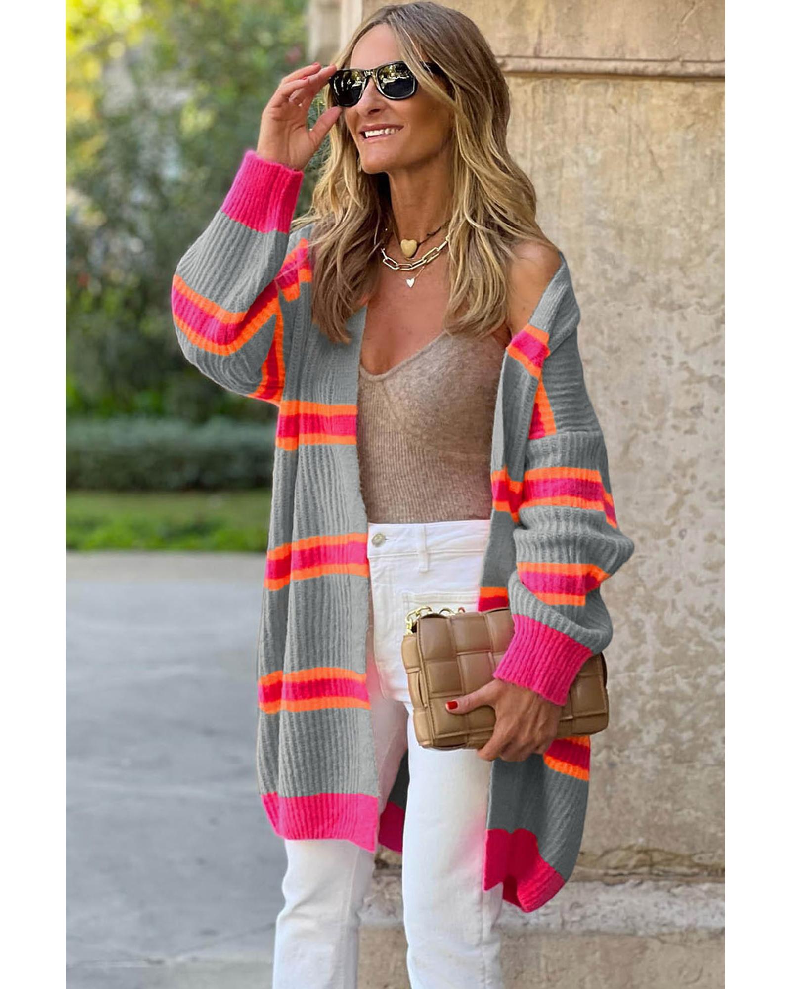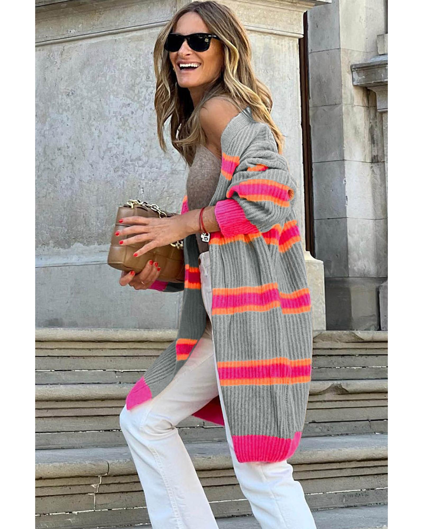 - Medium Grey Stripe Printed Ribbed Long Knitted Cardigan