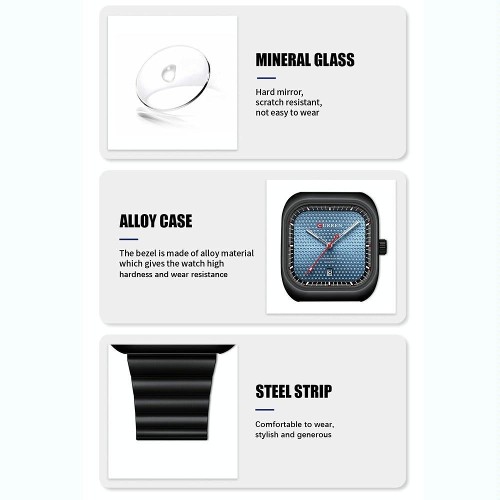 Men Square Steel Strap Quartz Watch – Casual Style – Black Shell Blue