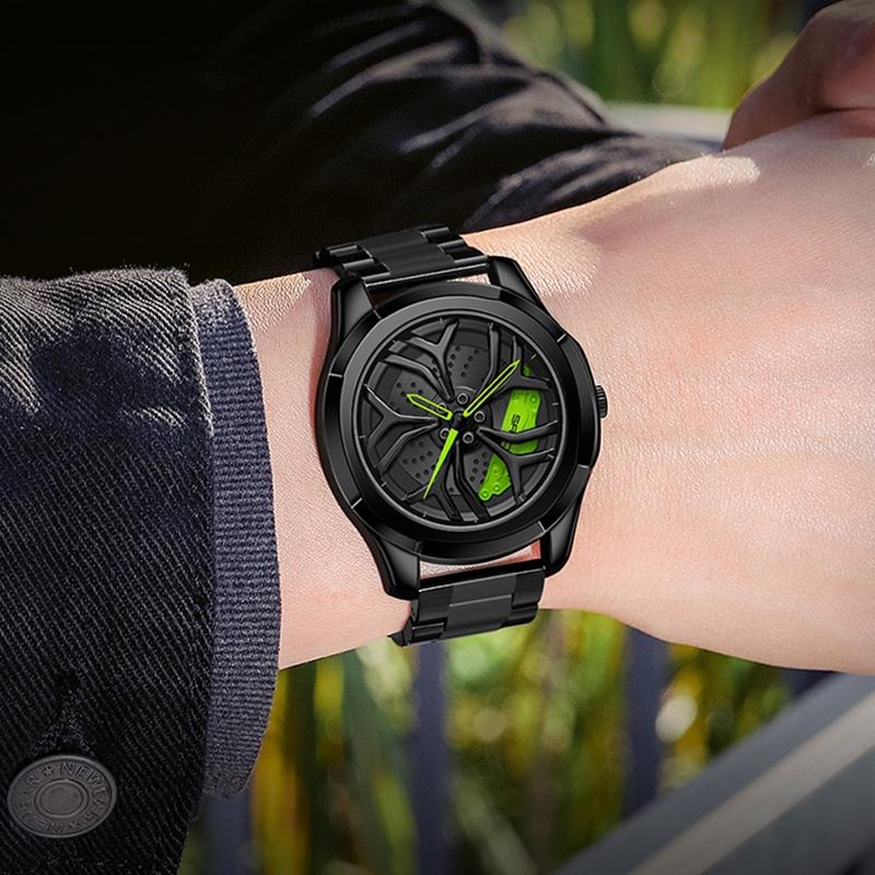 Men Steel Belt Quartz Watch with 3d Hollow out Wheel Design – Silver Green
