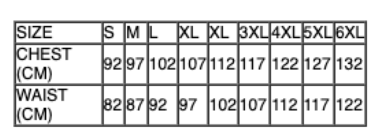 | SIZE | S | M | L | XL | XL | 3XL | 4XL | 5XL | 6XL |
