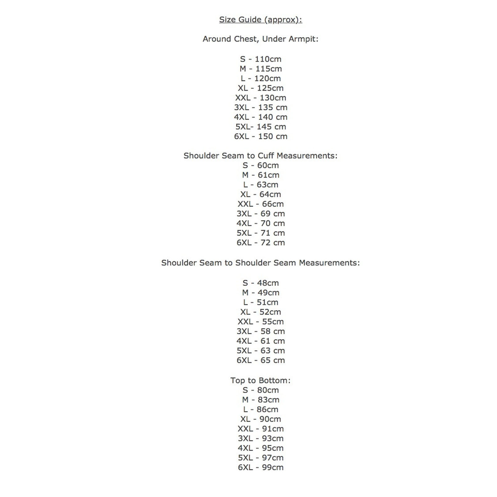 - Available sizes: Small –> 6XL!