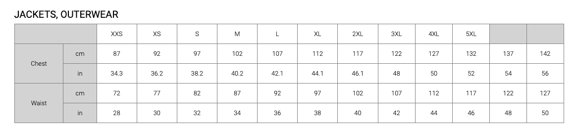 - Sizes: 92R – 142R (AUS NZ); 36R – 56R (CA)