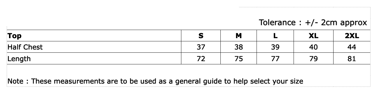 | Chest (armpit – armpit) | 33cm | 35cm | 37cm | 39cm | 41cm | 43cm |
