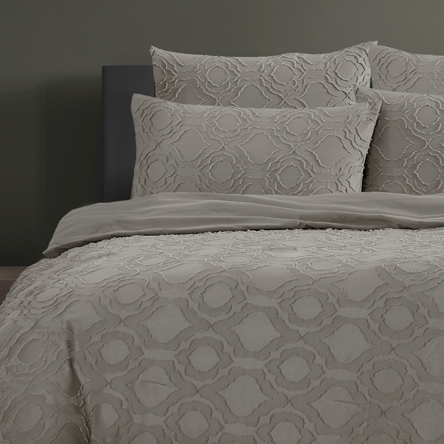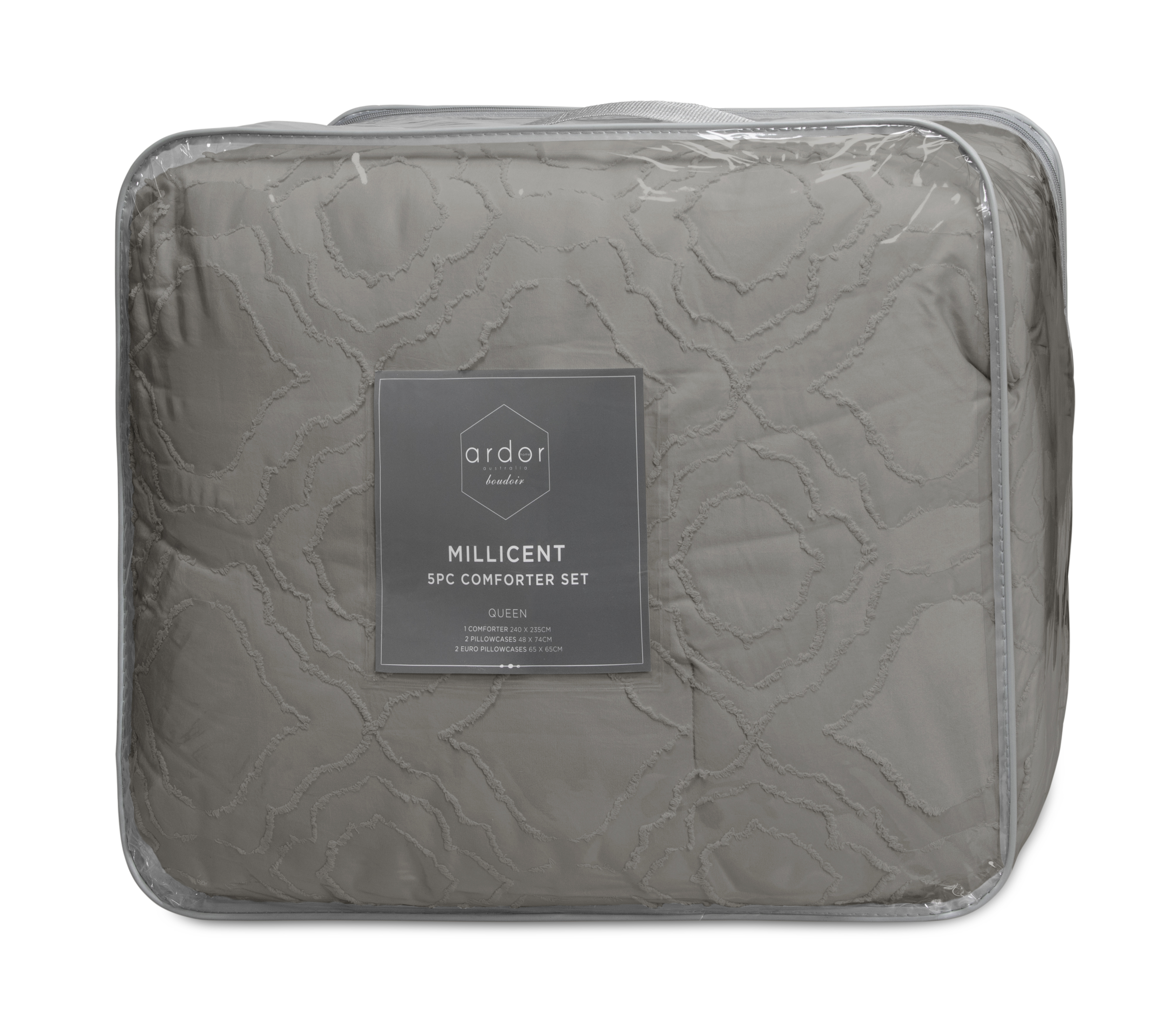 Millicent’s storm grey front displays a tufted pattern that softly gestures inspiration from floral tiles with a plain dyed reverse. This comforter set consists of 5 pieces – 1 x Comforter, 2 x Standard Pillowcases and 2 x European Pillowcases that will completely transform the bedroom aesthetics into tranquility.