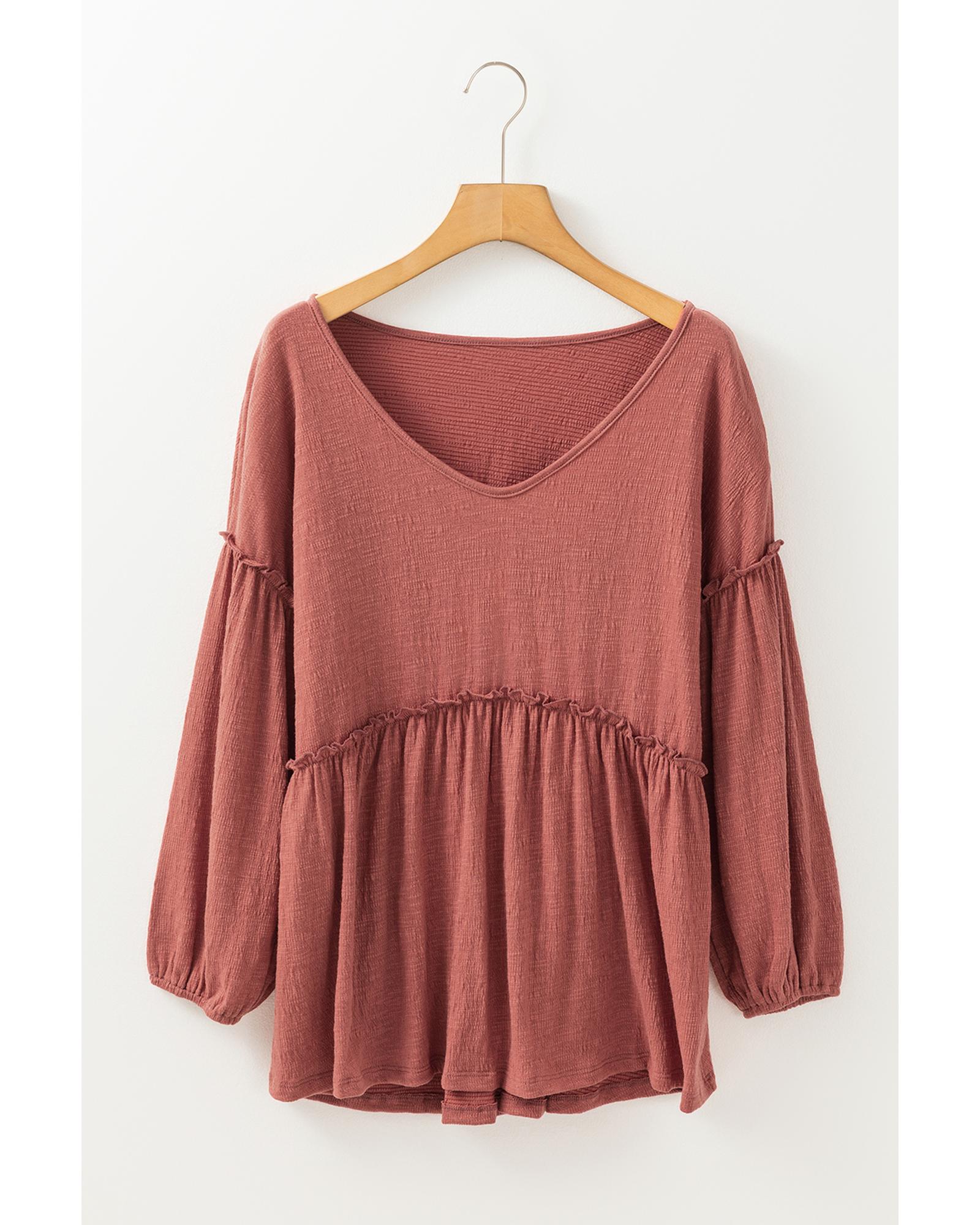 Mineral Red Solid Color Textured Frilled Trim V Neck Puff Sleeve Blouse – S