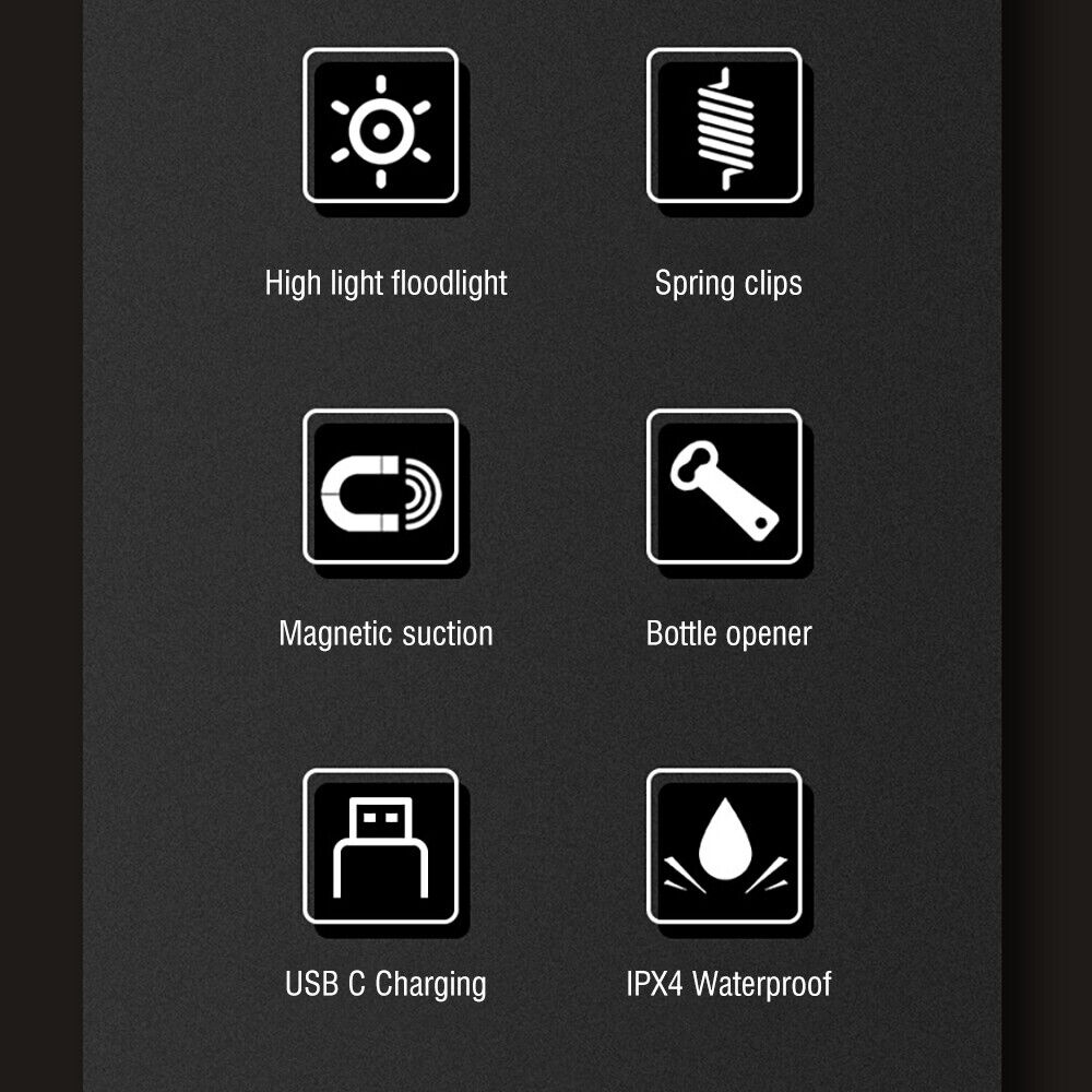 rear magnetic suction, compact and portable, Type-C charging, can be used as a bottle opener, life and prevention, 175 degree ultra wide angle floodlight, snap fastener