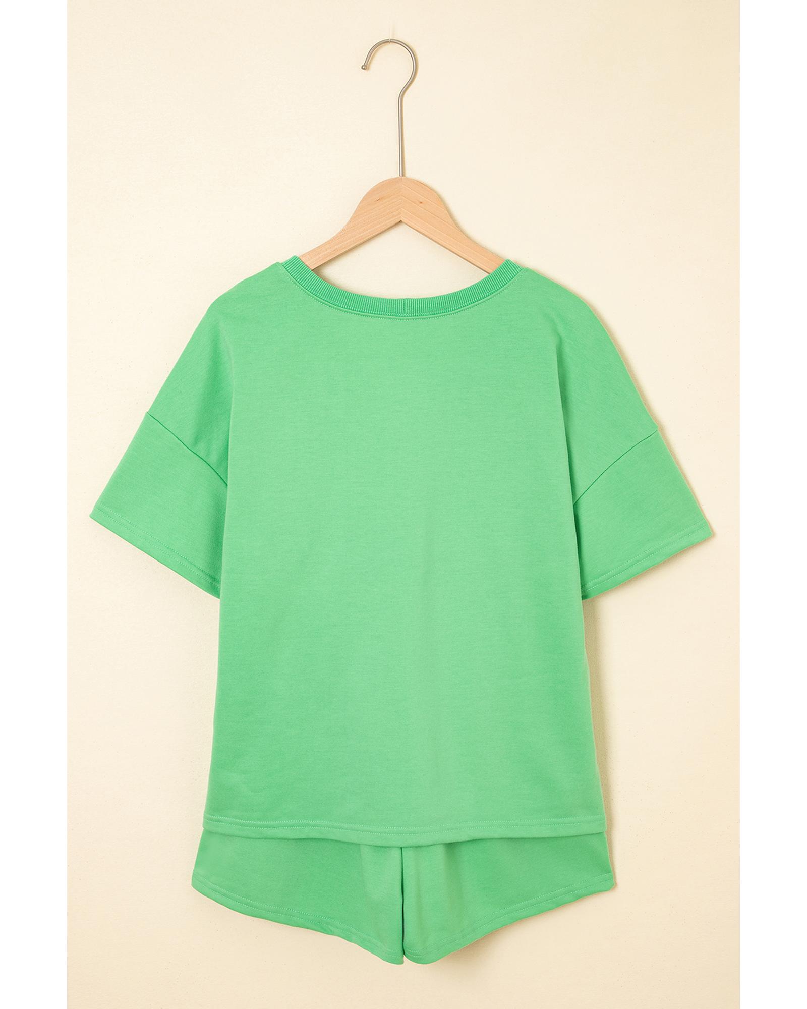 Mint Green V Neck Drop Shoulder Tee and Patchwork Drawstring Shorts Set - S Original price was: $64.99.Current price is: $34.99.