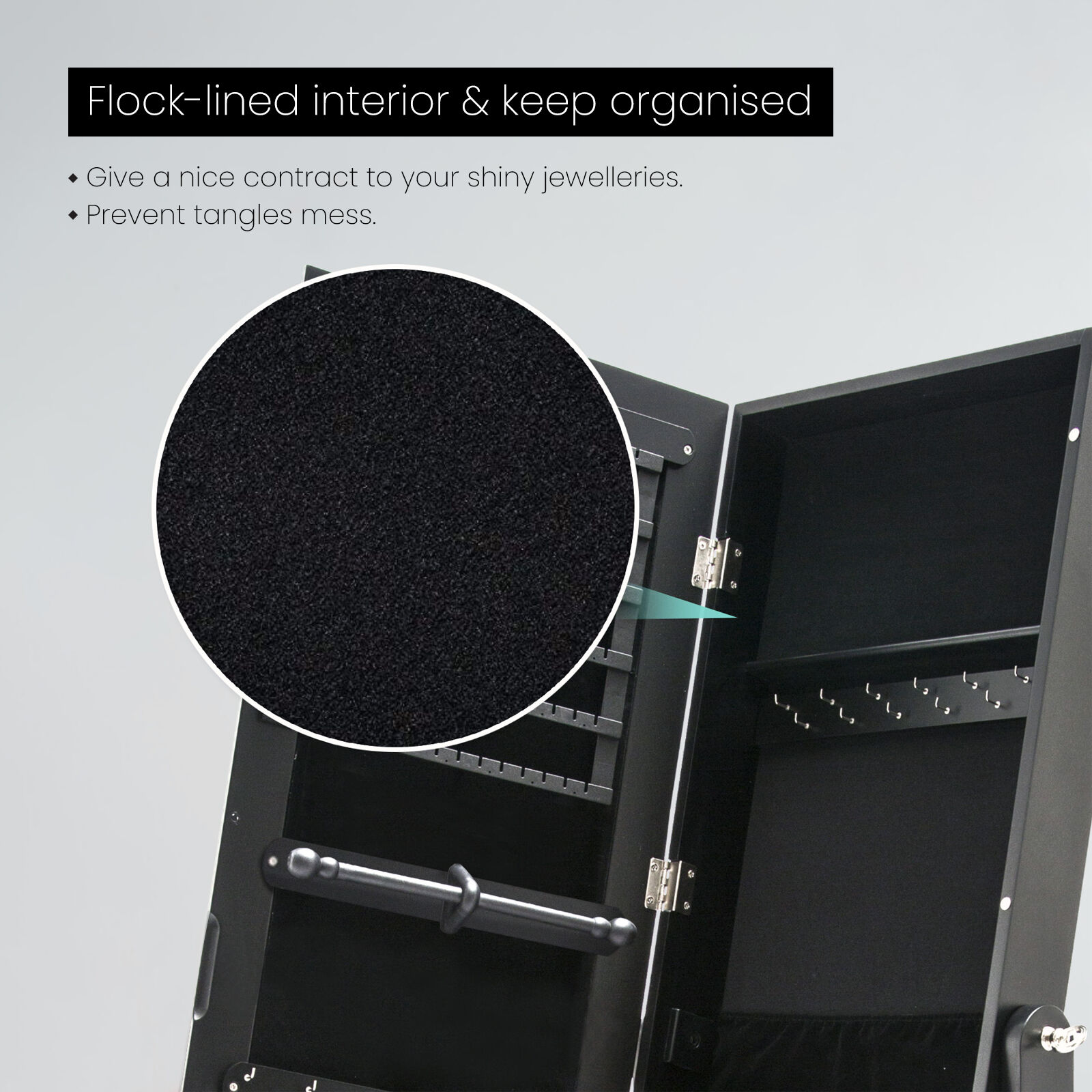 There are many earring hangers, necklace hooks, ring slots, and shelves to make it easier to separate and organise your precious jewelleries. You can certainly find many ways to arrange your accessories so you will be able to find a perfect way only for yourself! The black flock-lined interior will give your shiny jewelleries a nice contrast and under light, it will look even better!