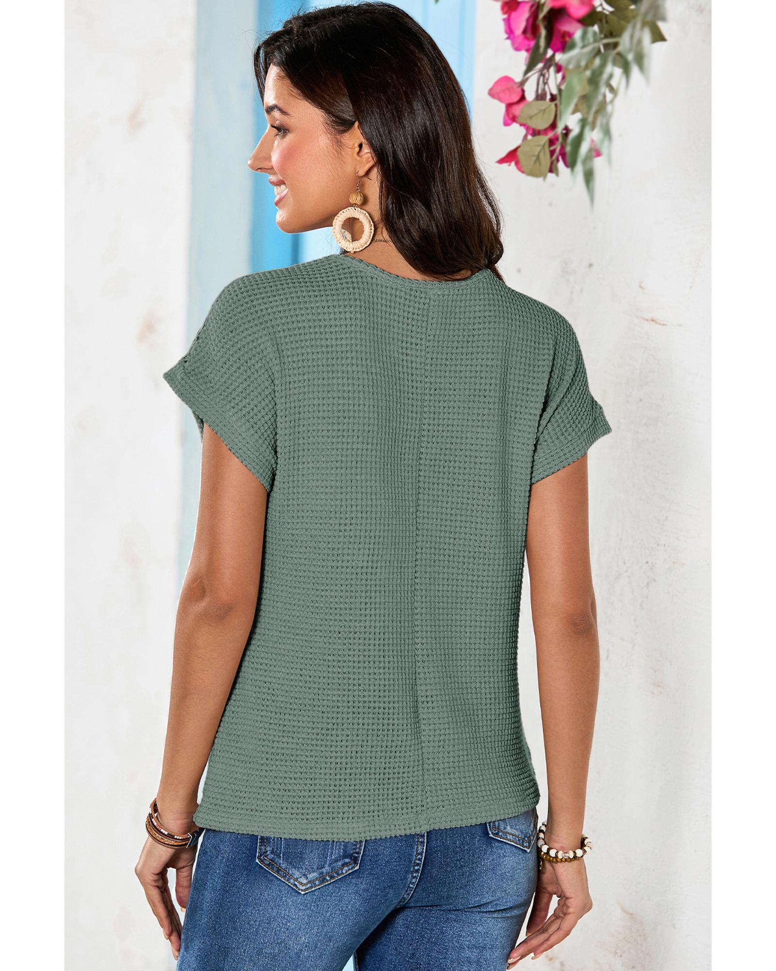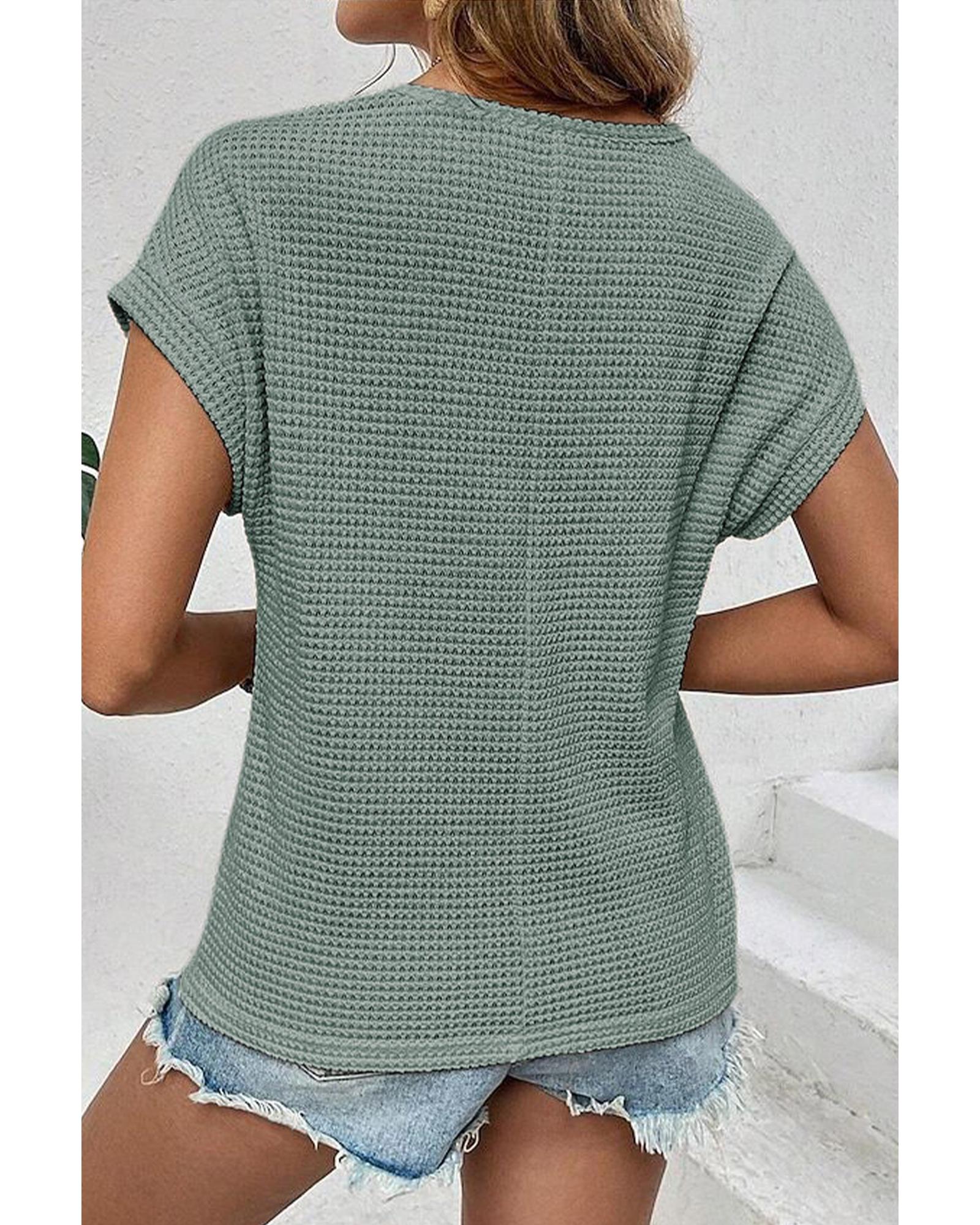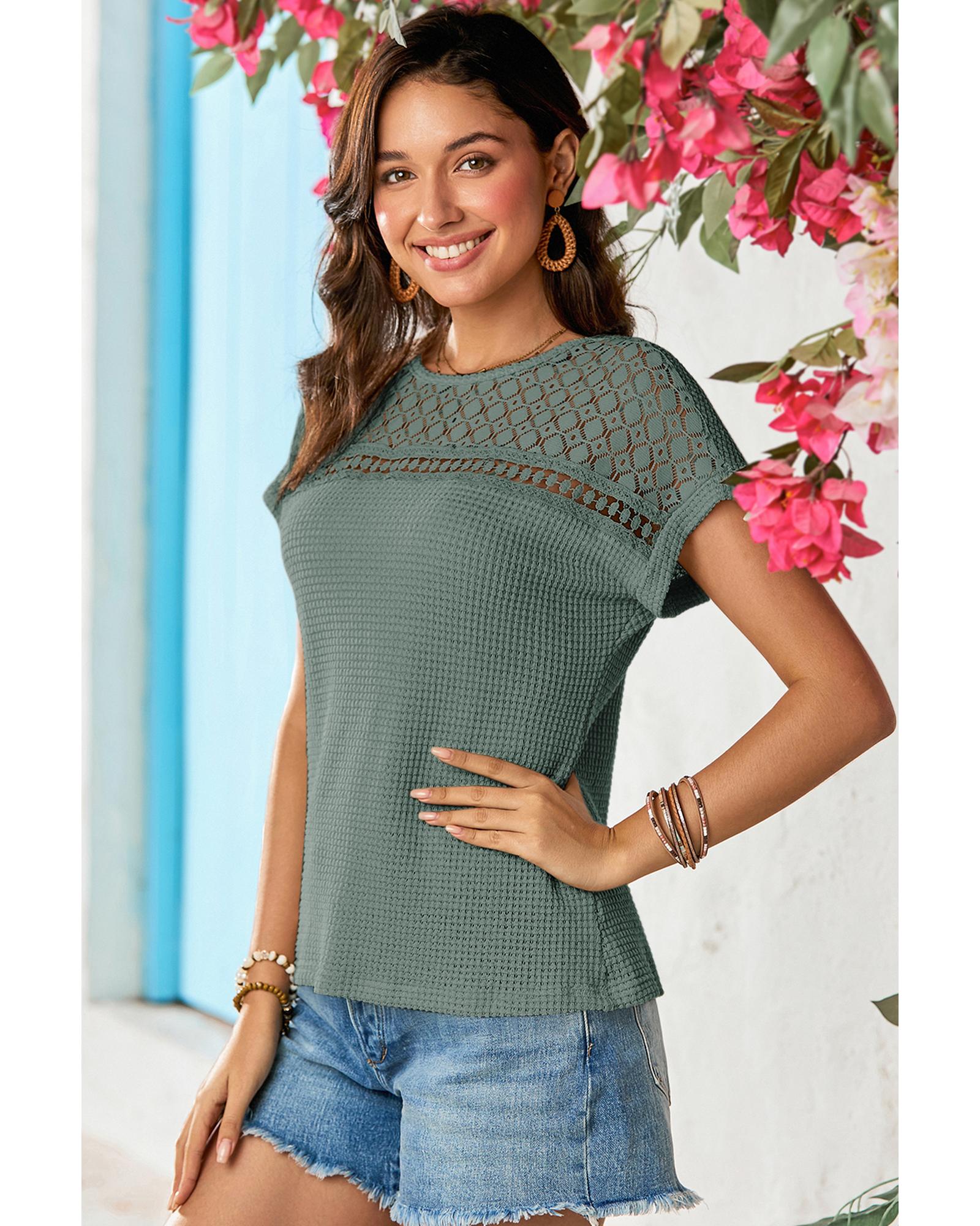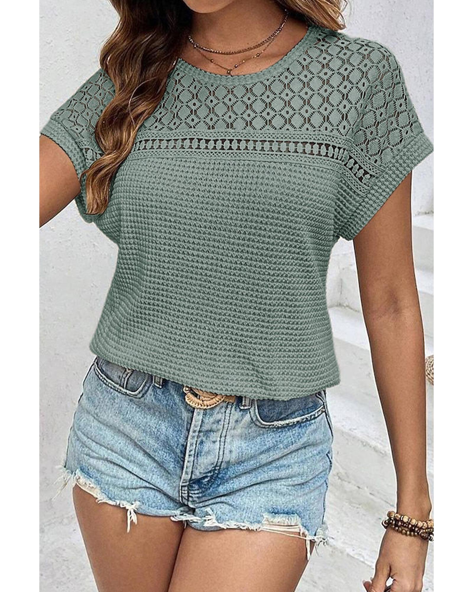 Mist Green Lace Patchwork Waffle Short Sleeve Top – 2XL