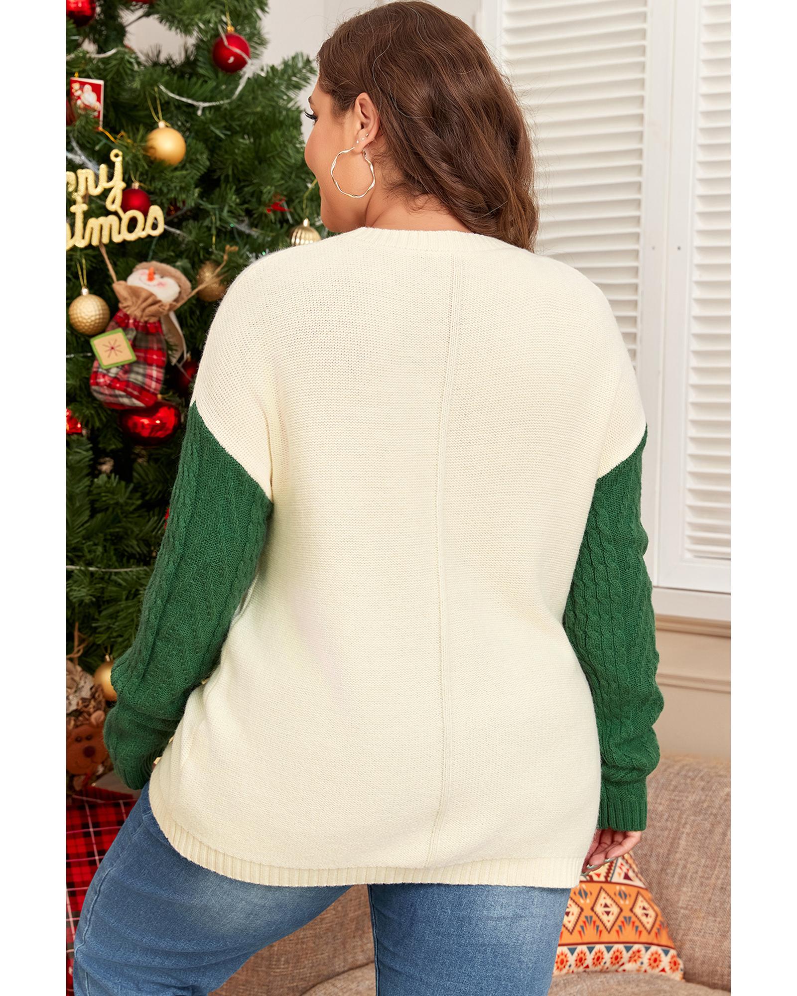 Mist Green Plus Size Cable Knit Color Block Drop Shoulder Sweater – 2X