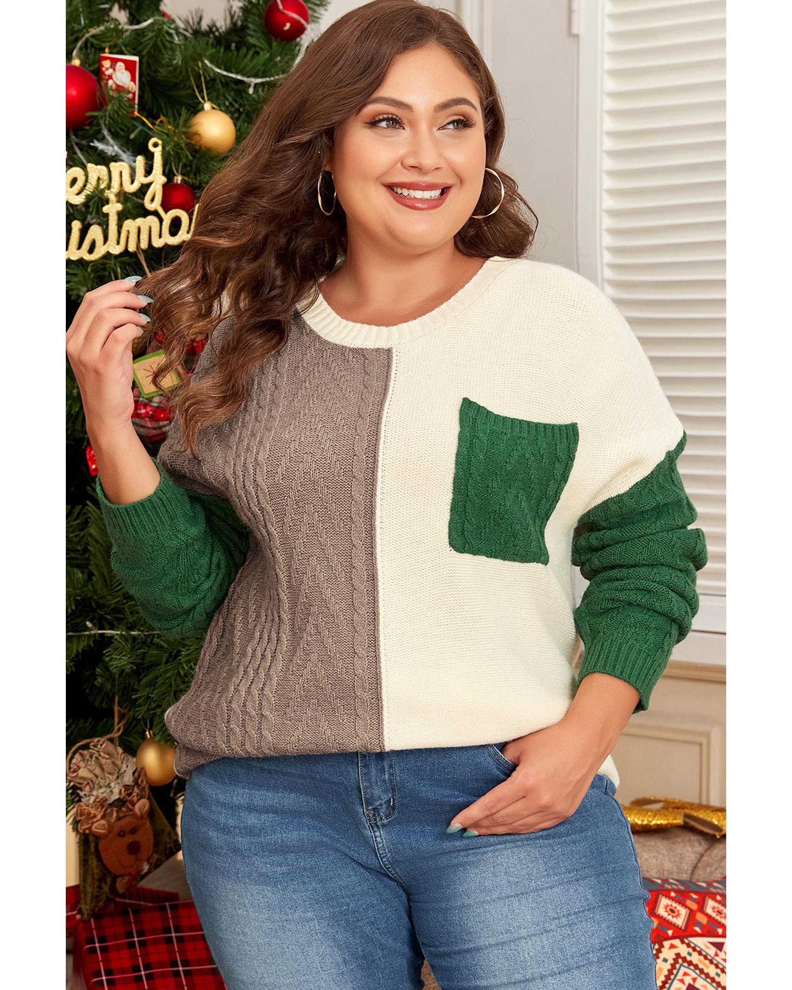 Mist Green Plus Size Cable Knit Color Block Drop Shoulder Sweater – 4X