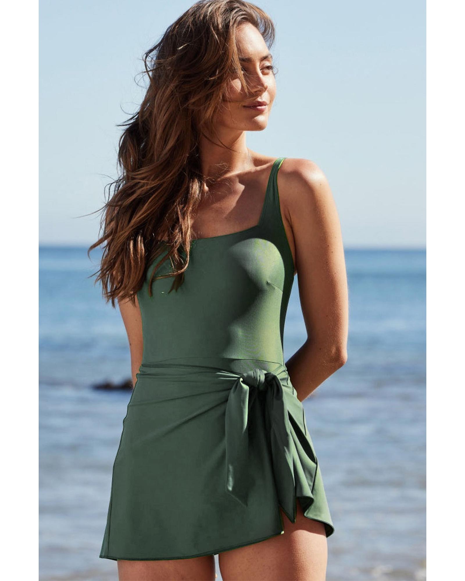 Mist Green Side Tied Waist Square Neck Adjustable Straps A-line One Piece Swim Dress – XL