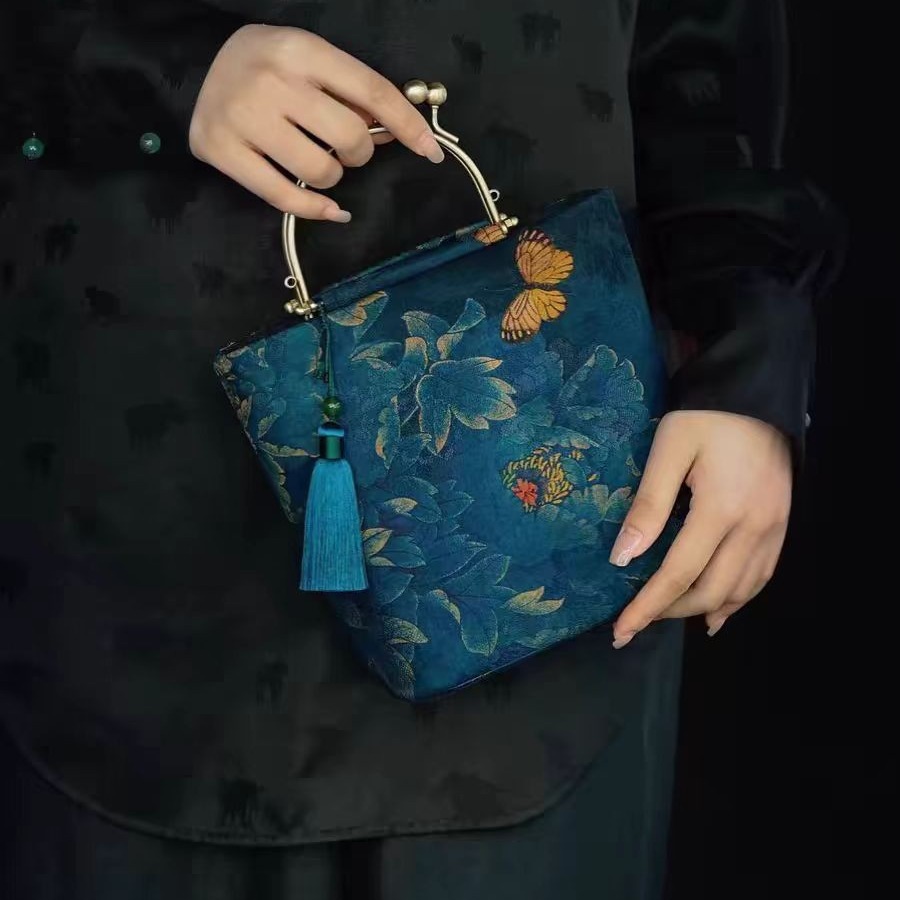 Adorned with intricate embroidery, this bag showcases classic Chinese motifs. The structured bucket shape offers a spacious interior for all your essentials, while the delicate tassel adds a touch of graceful movement. Versatile enough to complement a cheongsam, Hanfu, or even your everyday attire, this bucket bag is a must-have for those who appreciate beauty and craftsmanship. The metal handles add to the elegant vibe.