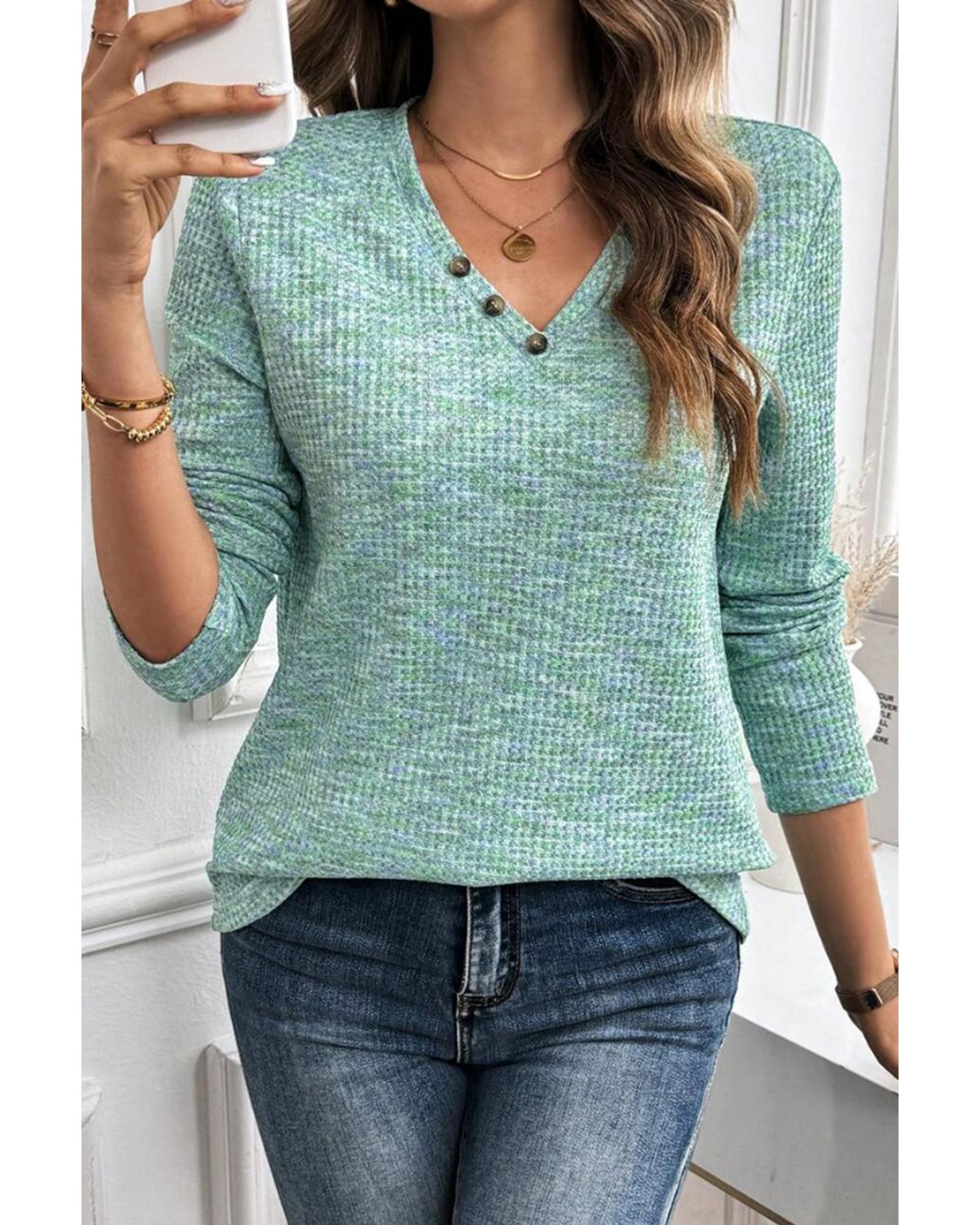 Moonlight Jade Buttoned V Neck Textured Knit Long Sleeve Top – 2XL