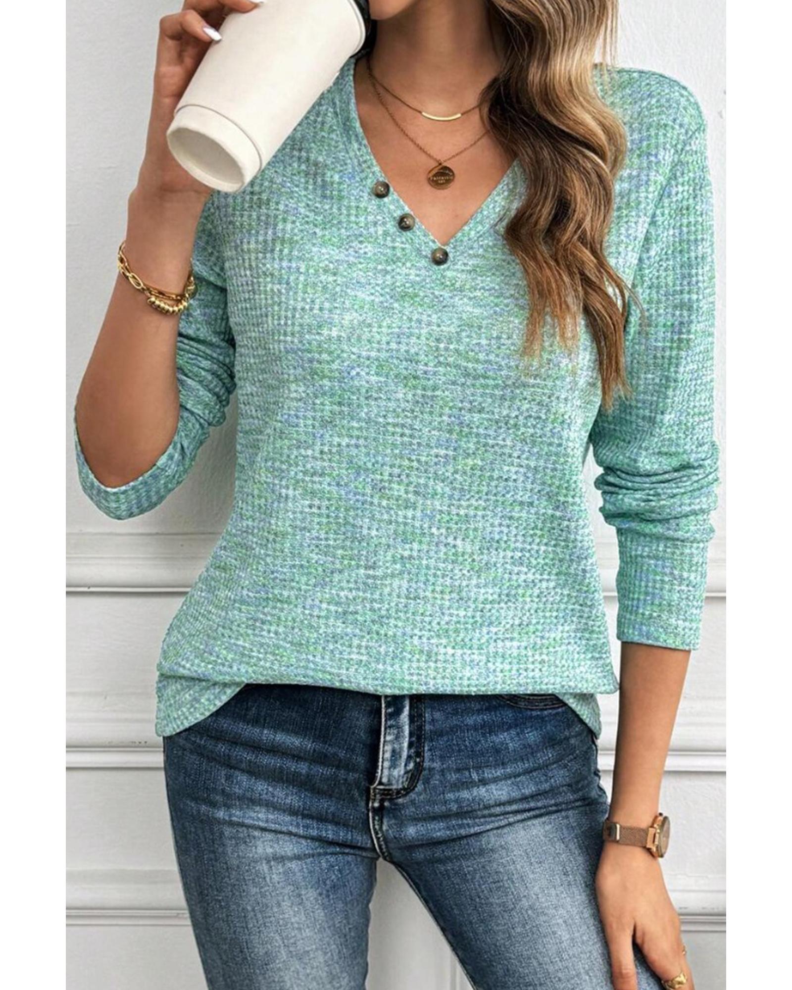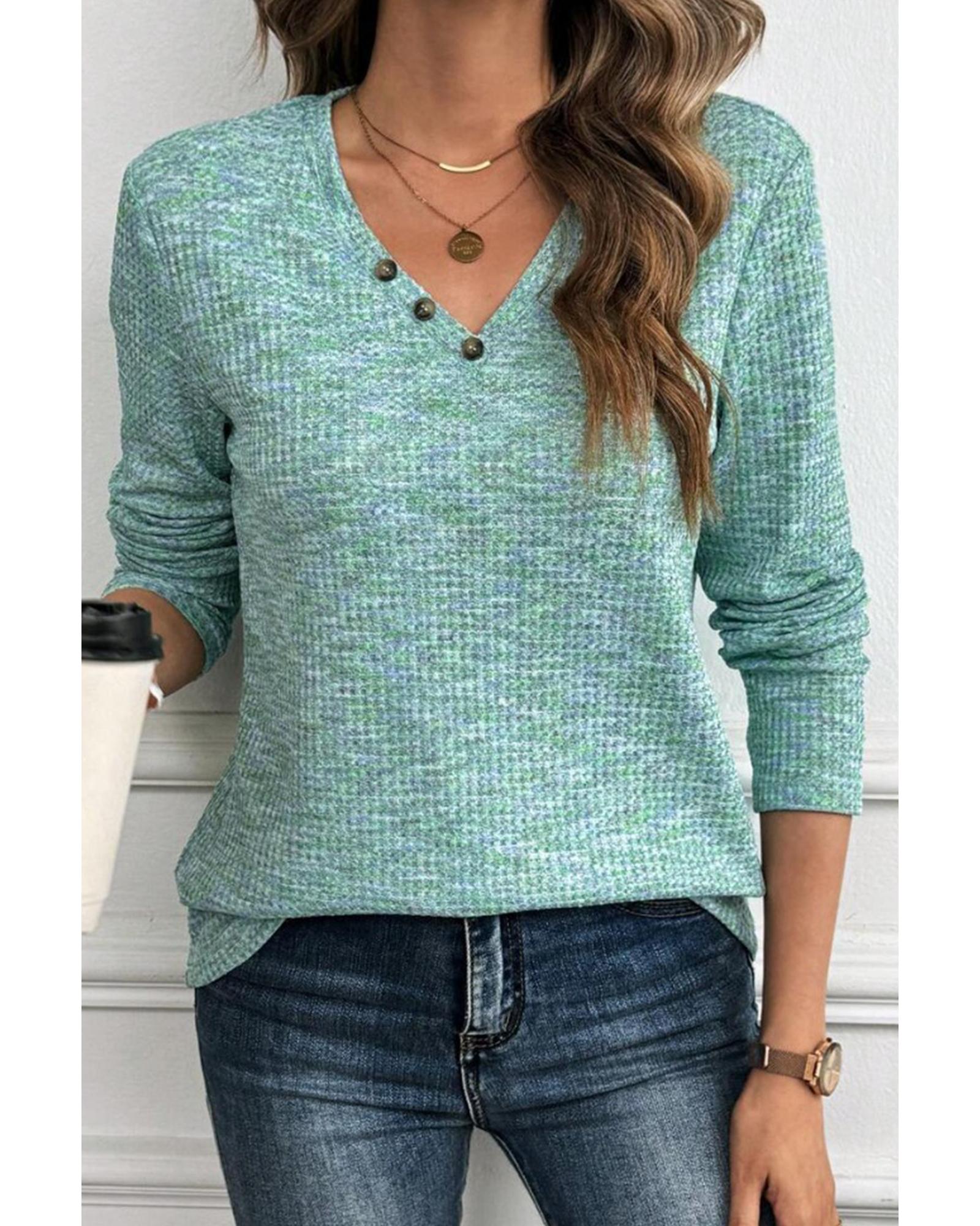 Moonlight Jade Buttoned V Neck Textured Knit Long Sleeve Top – L