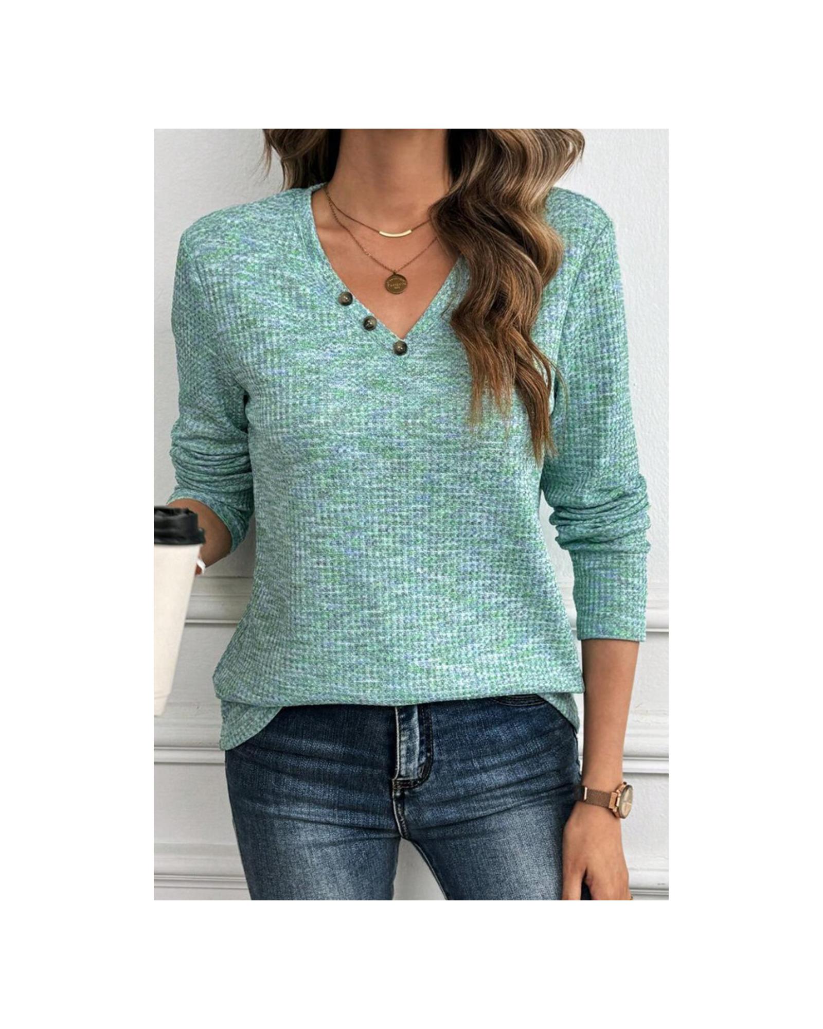 Moonlight Jade Buttoned V Neck Textured Knit Long Sleeve Top – S