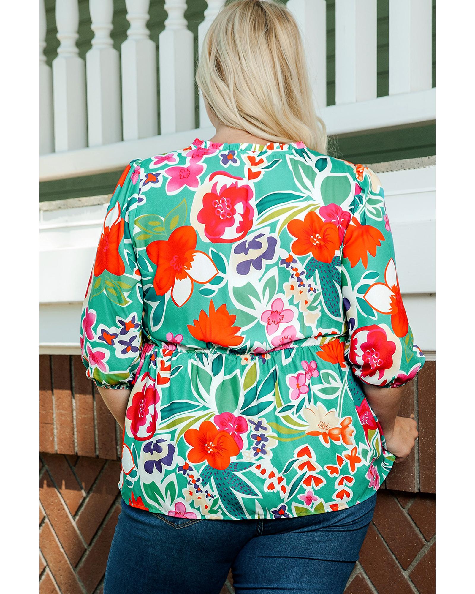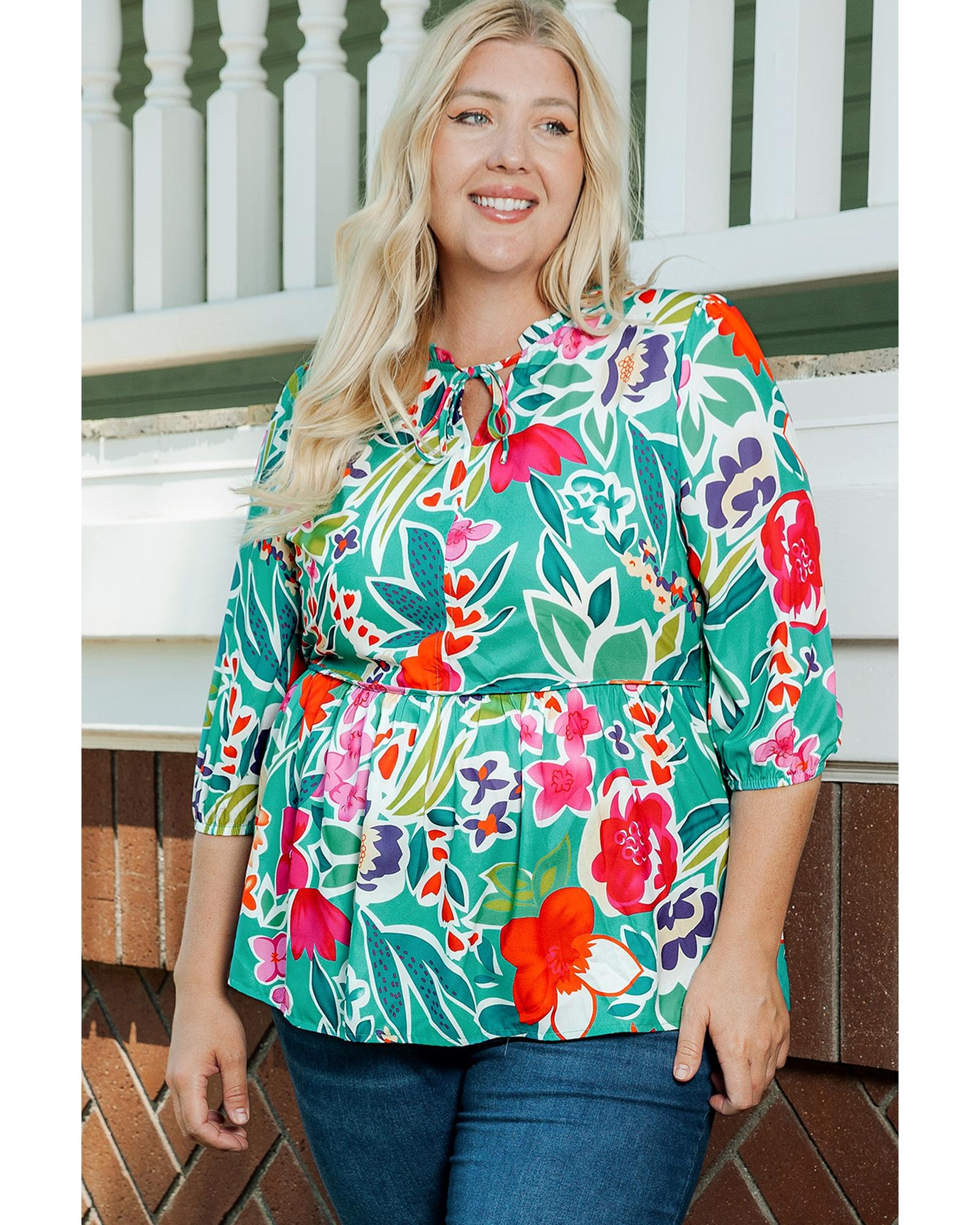 Multicolor Floral Tie Split Neck Plus Size Peplum Blouse – 2X