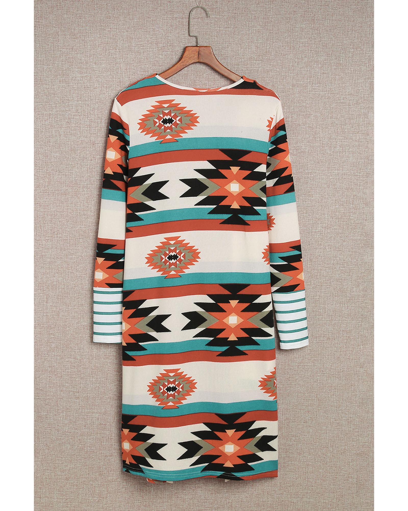• Multicolor Geometric Color Block Open Front Long Cardigan