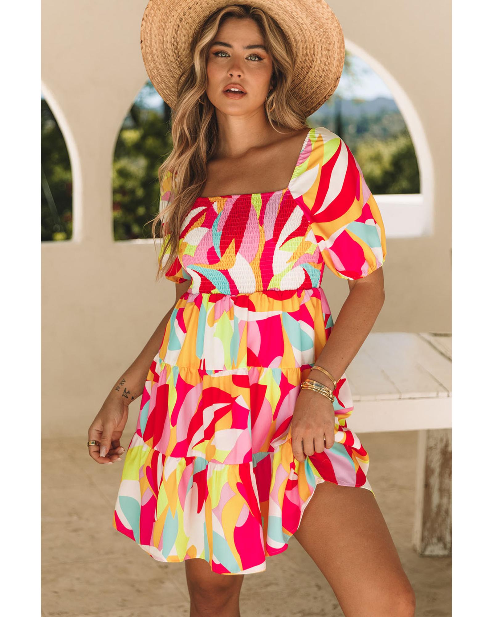 Multicolor Geometric Print Smocked Babydoll Mini Dress – S