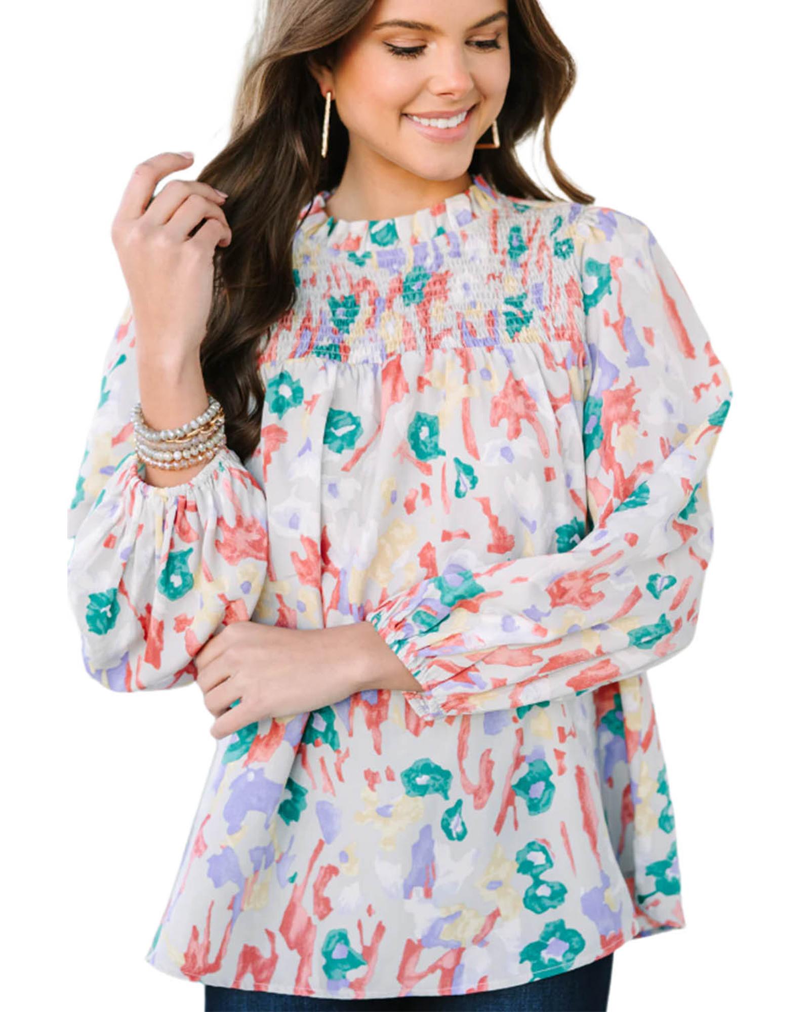 Multicolor Printed Frilled Neck Smocked Loose Blouse – S