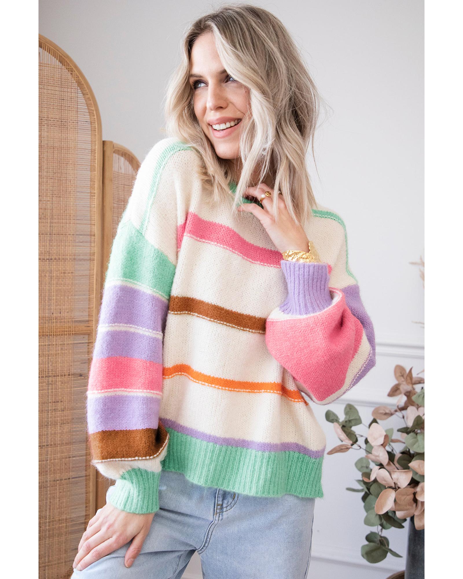 Cute and attention - getting striped and colorblock design Soft warm and stylish knitwear for the winter season Classic round neck design High