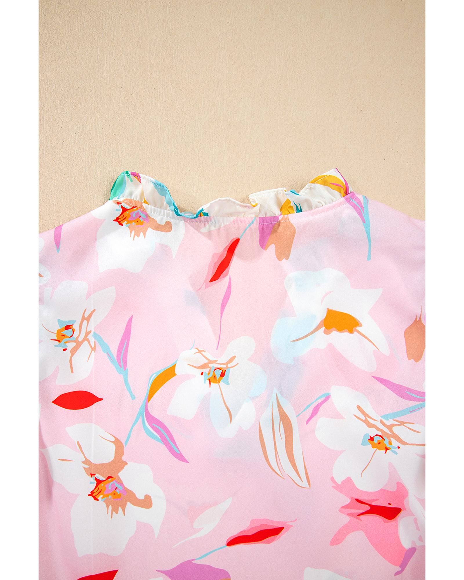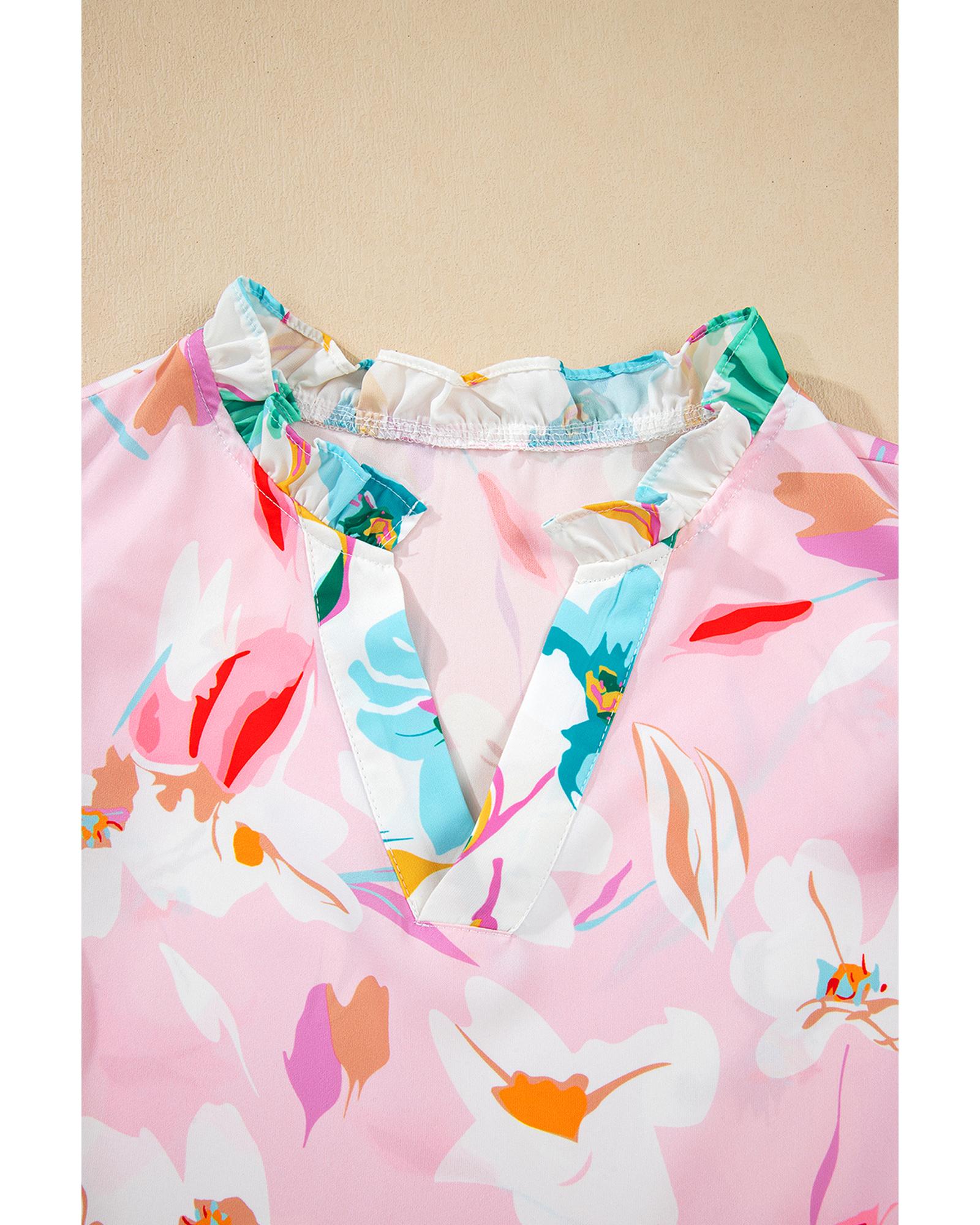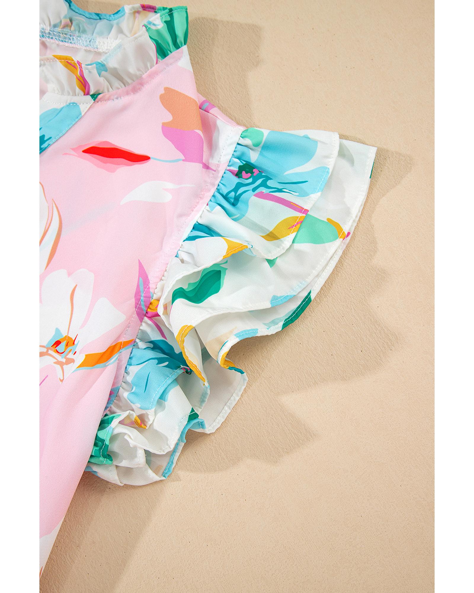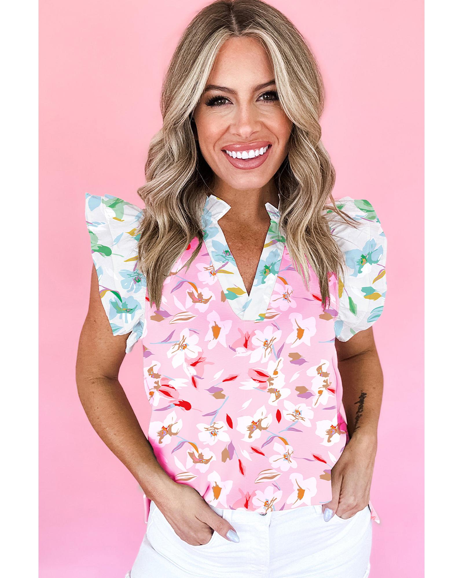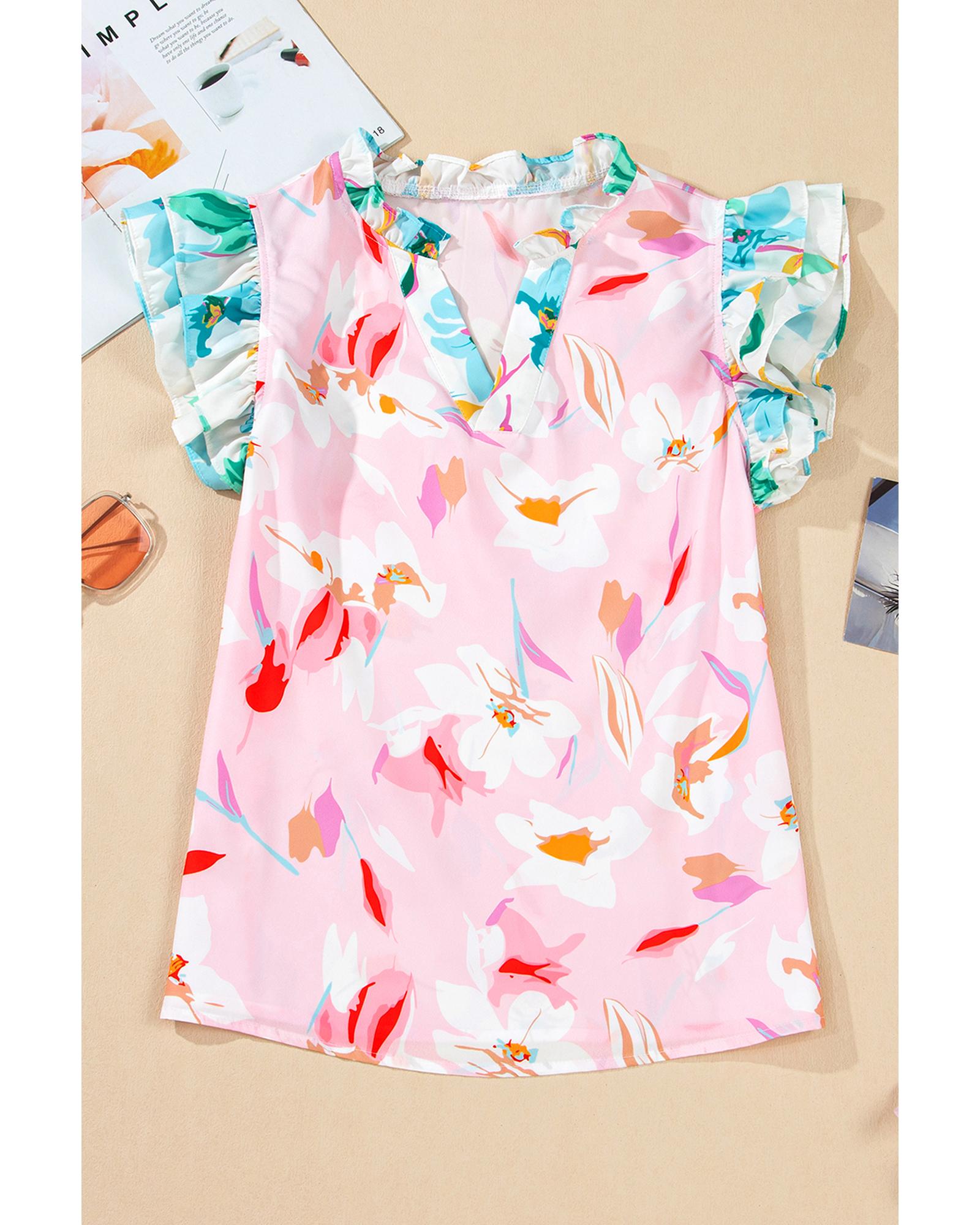 Multicolour Contrast Floral Patchwork Notched Neck Flutter Sleeve Blouse – XL