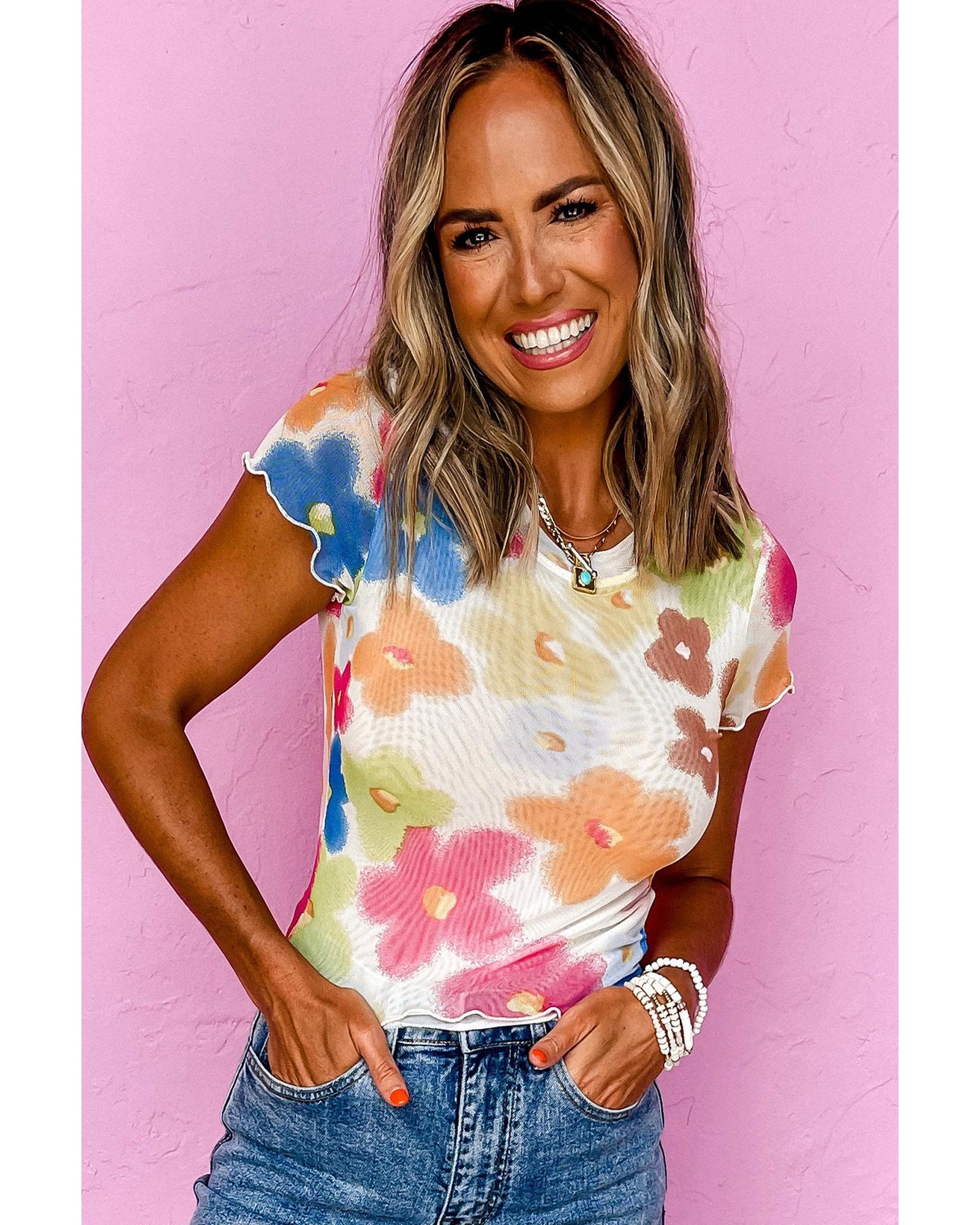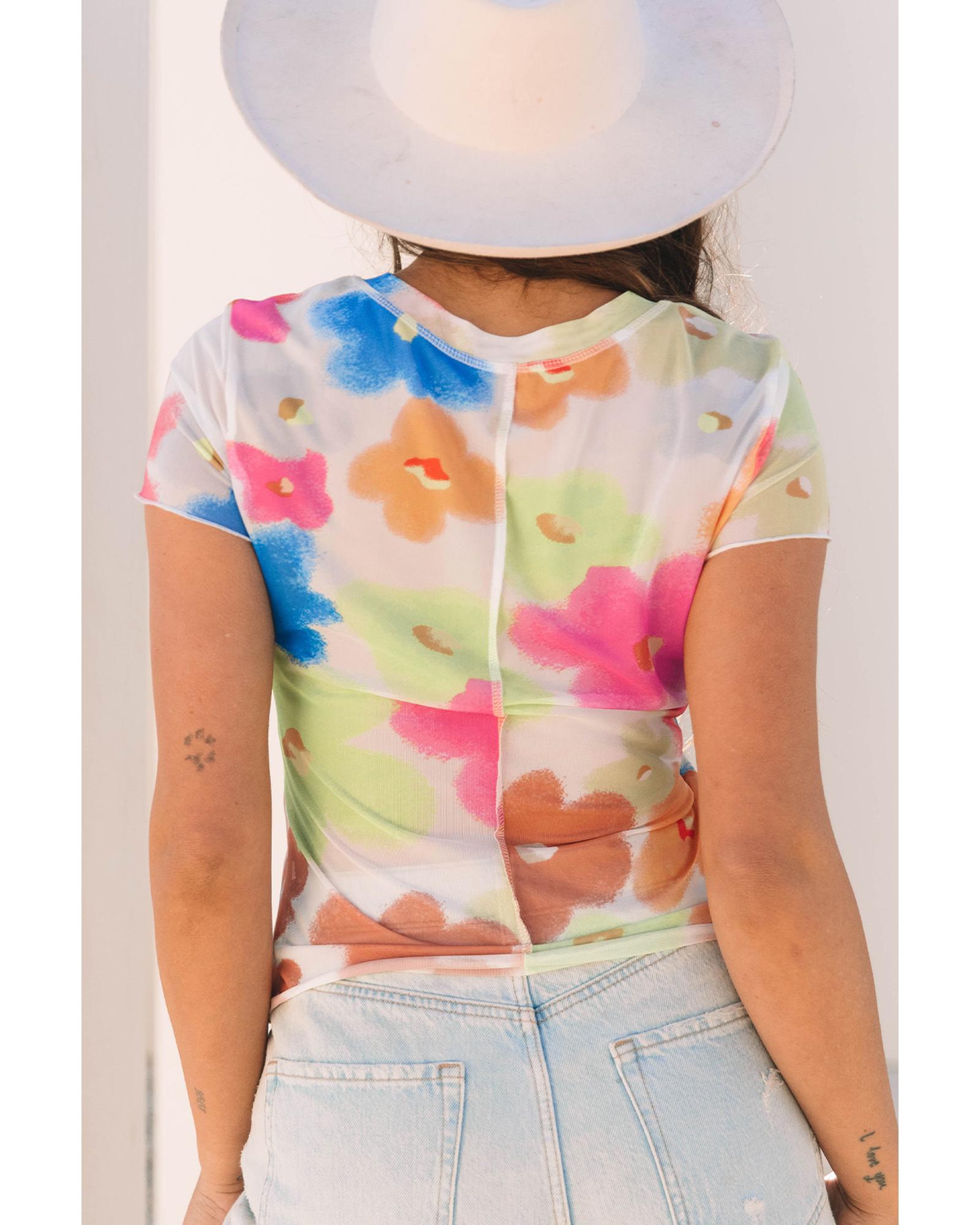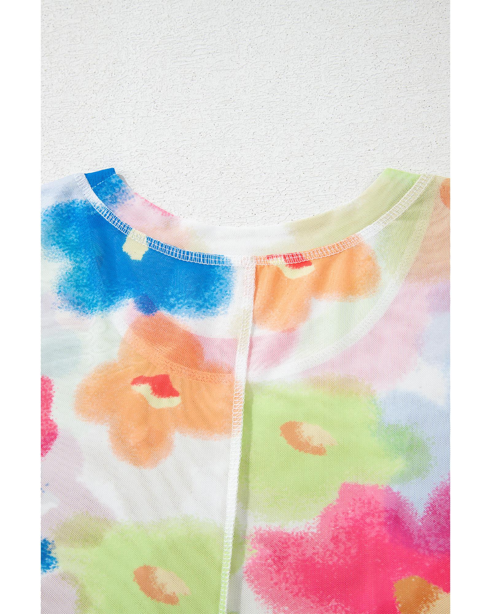 Multicolour Floral Mesh Lettuce Trim Cropped T Shirt – L