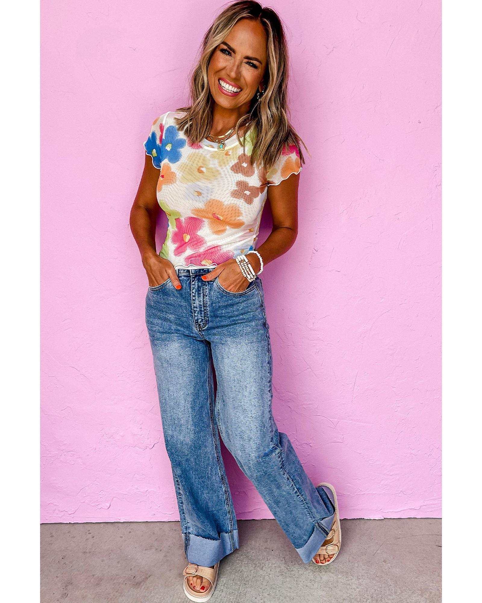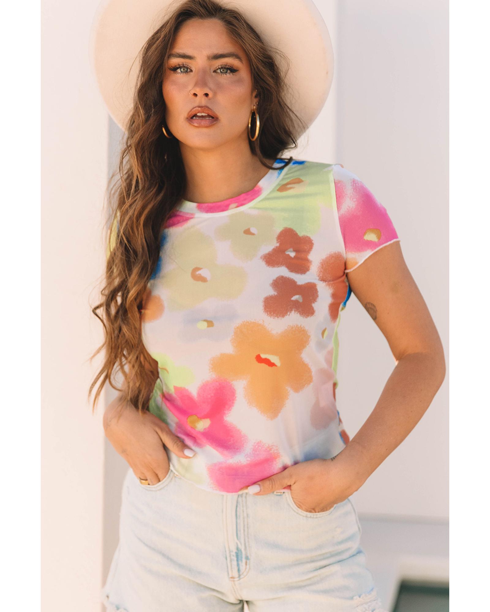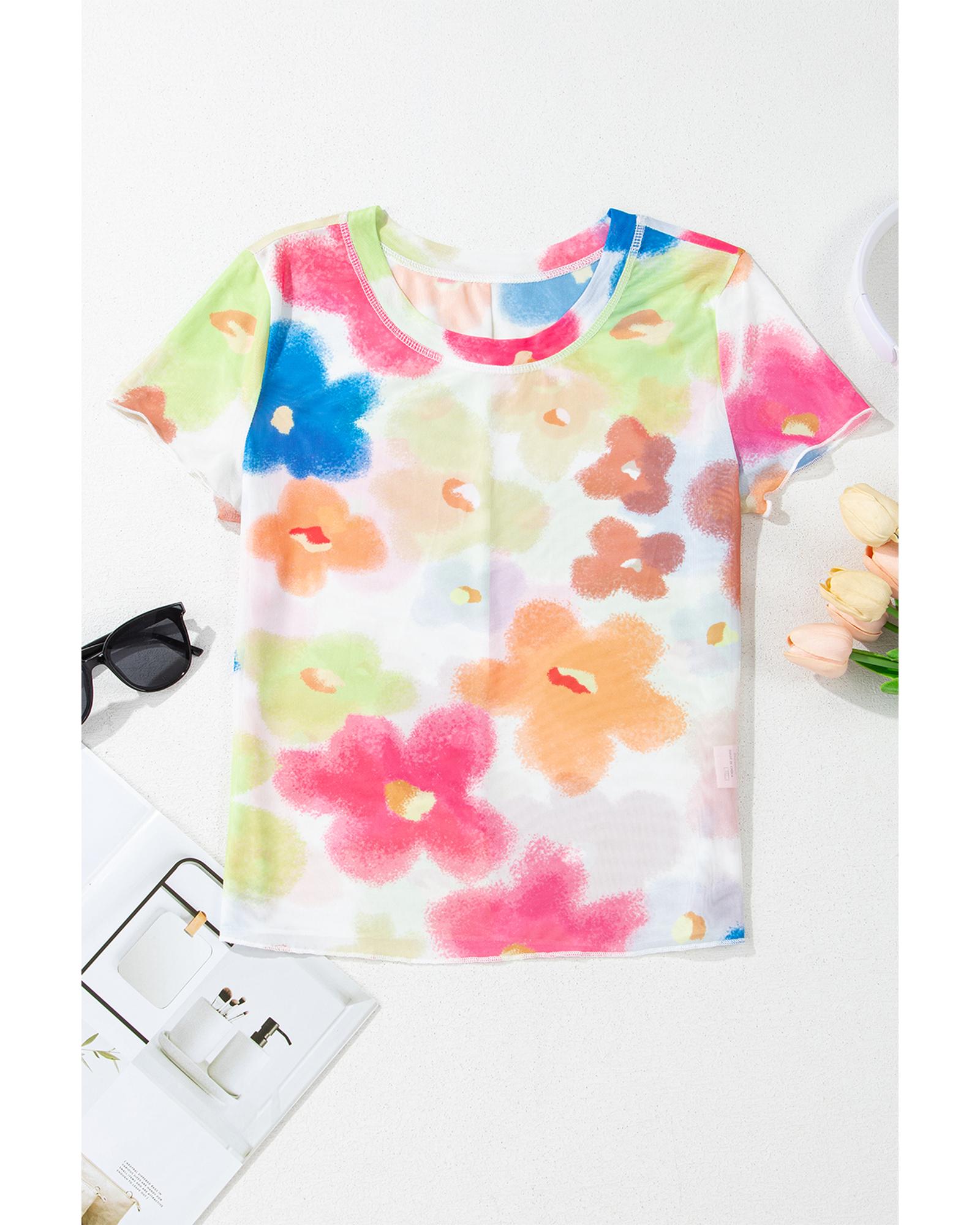 Multicolour Floral Mesh Lettuce Trim Cropped T Shirt – XL